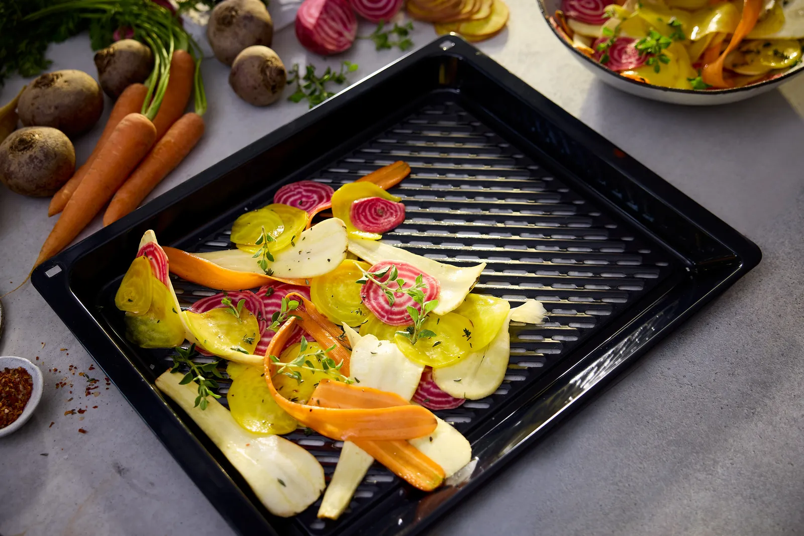 - Si consiglia di aggiungere una teglia nella parte inferiore del forno, ideale come vassoio di raccolta per la teglia Air Fry e grill.