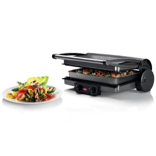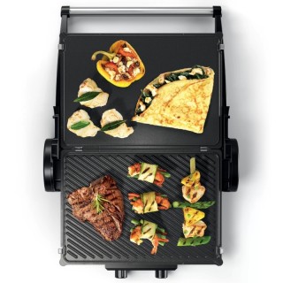 - Multifunzione grazie alle 3 posizioni di cottura e alle piastre reversibili: Bistecche succose, gustosi hamburger, spiedini croccanti e dorati, toast, panini, tramezzini o focacce: goditi tutto ciò che ti piace. Le tre posizioni di cottura di questa bistecchiera offrono possibilità praticamente illimitate per realizzare le tue idee creative in cucina. Chiusa come grill normale a contatto, aperta come barbecue da tavolo o chiusa con riscaldamento superiore e inferiore per gratinare o riscaldare. Le piastre, inoltre, sono reversibili e dotate di superficie liscia e ondulata.