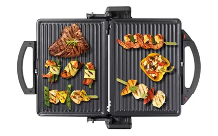 Bistecche succose, gustosi hamburger, spiedini croccanti e dorati, toast, panini, tramezzini o focacce: goditi tutto ciò che ti piace. Le tre posizioni di cottura di questa bistecchiera offrono possibilità praticamente illimitate per realizzare le tue idee creative in cucina. Chiusa come grill normale a contatto, aperta come barbecue da tavolo o chiusa con riscaldamento superiore e inferiore per gratinare o riscaldare.