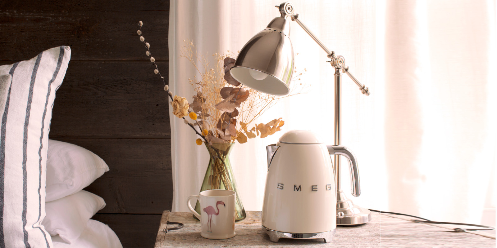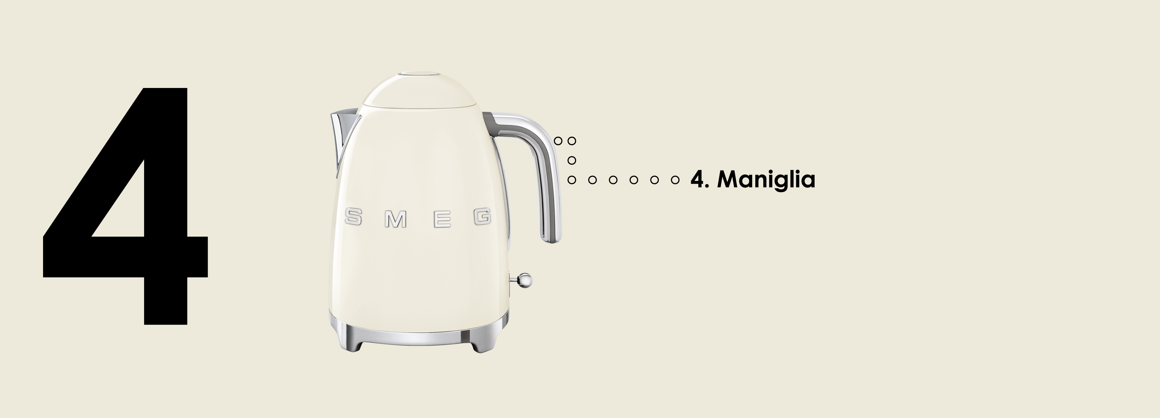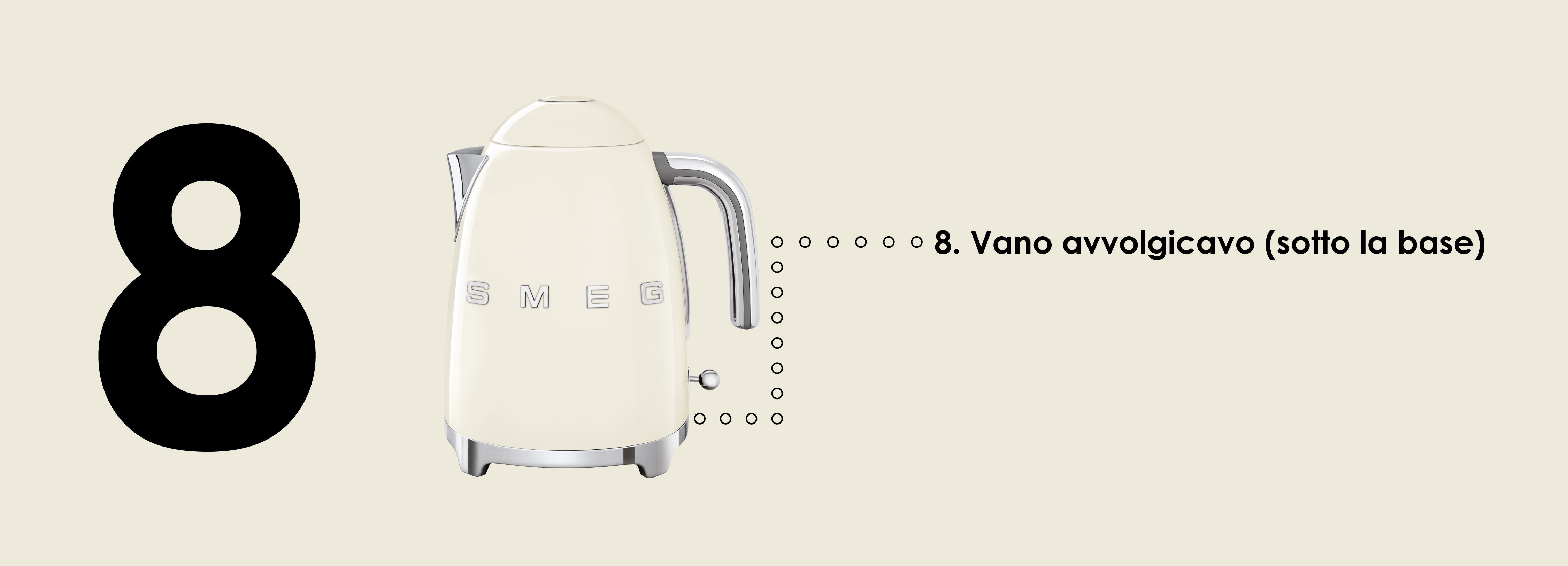 Bollitore Design Anni 50, Corpo in acciaio inox verniciato, Capacità caraffa 1,7 lt / 7 tazze, Apertura coperchio “Soft Opening”, Visualizzazione livello acqua lt/tazze, Spegnimento automatico a 100°C / assenza di acqua, Vano avvolgicavo integrato, Potenza 2400 W, Dimensioni (AxLxP) 248 x 226 x 171 mm
