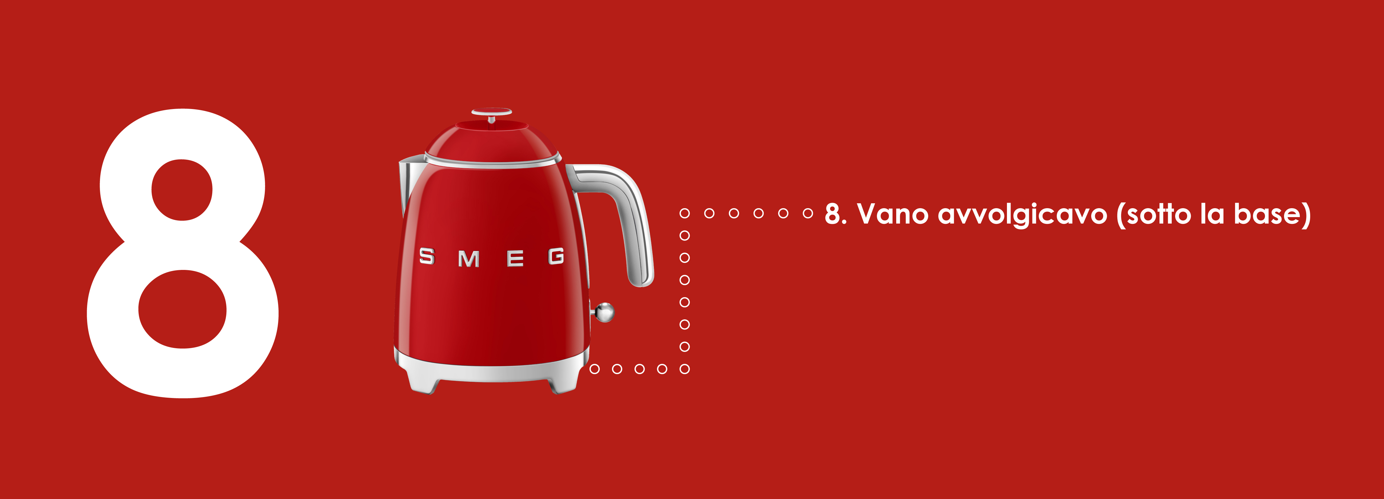 Bollitore Design Anni 50, Corpo in acciaio inox verniciato, Capacità caraffa 0,8 lt / 3 tazze, Visualizzazione livello acqua lt/tazze, Spegnimento automatico a 100°C / assenza di acqua, Vano avvolgicavo integrato, Potenza 1400 W, Dimensioni (AxLxP) 200 x 200 x 152 mm