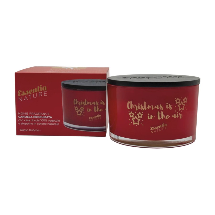Candela profumata Essentia Nature. Realizzata con cera di soia 100% vegetale per un'esperienza olfattiva unica. Stoppino in cotone naturale. 100 ore di piacevole diffusione della fragranza. Rosso Rubino racconta tutta la golosità di un profumo zuccherino dalle originali sfumature gourmand rimandando subito ad un clima di festa. Peso 450g