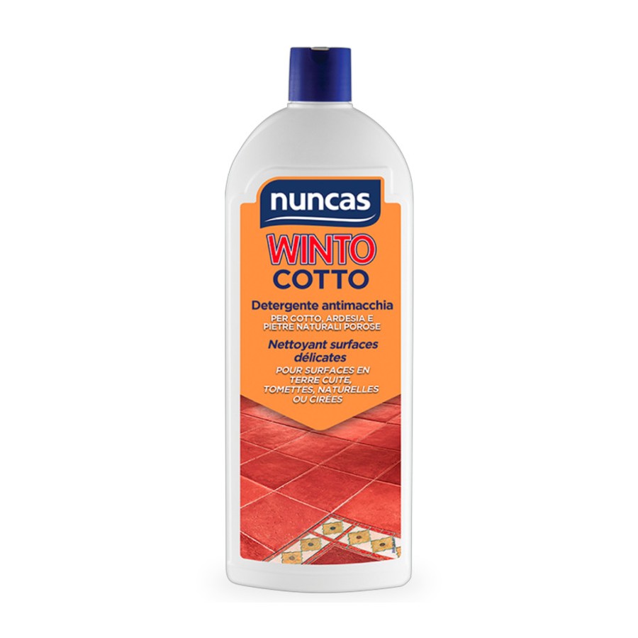Al vero cotto italiano, si devono le più belle realizzazioni architettoniche e artistiche del nostro patrimonio nazionale. E' un materiale la cui nascita si perde nel tempo ed ancora oggi la sua bellezza e naturalità è motivo di orgoglio per gli artigiani che lo producono e soprattutto per chi lo sceglie per la propria casa, rustica o moderna che sia. Pensate che è il materiale più biologico che possa esistere: argilla e acqua in un unico morbido impasto! Il suo pregio però deve fare i conti con qualche piccola manutenzione in più: è un materiale molto poroso ed assorbe facilmente acqua e macchie che penetrano facilmente e tendono a macchiare la sua bella superficie. Winto Cotto di Nuncas agisce come un delicatissimo peeling cosmetico: deterge e cancella gli aloni e le piccole macchie portando in superficie tutto il colore e il calore del vero cotto antico, senza danneggiarlo durante la pulizia.