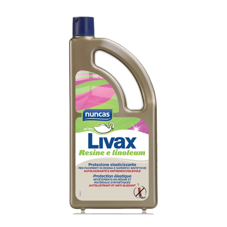 Nuncas Livax Resine e Linoleum è una cera metallizzata autolucidante e antisdrucciolevole per ravvivare e rinnovare i pavimenti in gomma, superfici in linoleum, PVC e materiali sintetici. Flacone 1L