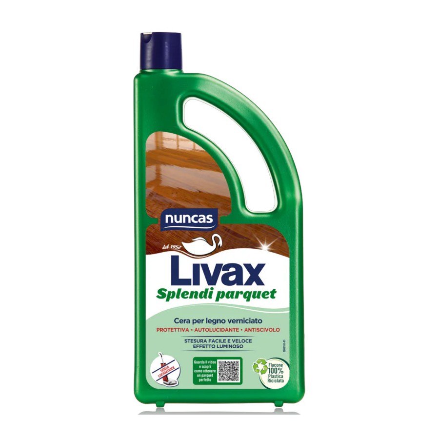 Nuncas Livax Splendi Parquet è una cera auto lucidante e antisdrucciolevole, studiata appositamente per proteggere e rendere brillanti e lucidare tutti i parquet verniciati, senza bisogno di passare la lucidatrice. Flacone 1L