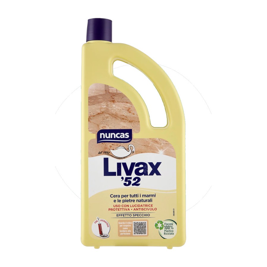 Nuncas Livax Cera 52 è una cera per pavimenti in marmo naturale e lucidato a piombo, mosaici e seminato veneziano. Profumata, lucidante e di eccezionale qualità ideale per proteggere dall'usura, dallo sporco e dalla polvere. Una cera tradizionale di qualità davvero superiore, per far brillare a specchio i pavimenti in marmo. Flacone 1L