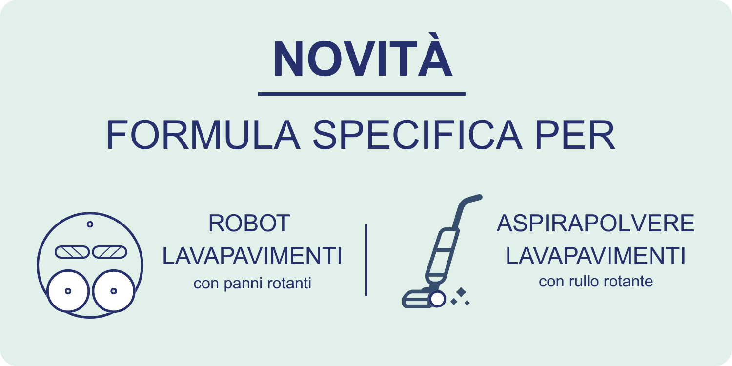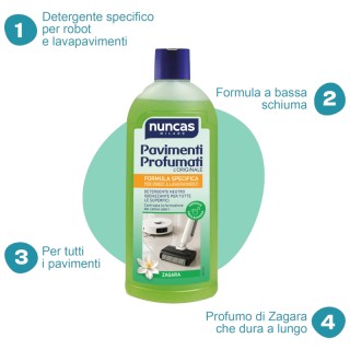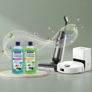 Per poter garantire una pulizia profonda tramite ausilio di questi dispositivi è importante affidarsi ad un detergente specifico e idoneo all'elettrodomestico. E Nuncas, come sempre, ha una nuova soluzione dedicata: Pavimenti Profumati Formula specifica per robot e lavapavimenti. Si tratta del detergente appositamente studiato per ottimizzare l'efficacia pulente di robot e lavapavimenti. La sua formulazione a bassa schiuma rispetta guarnizioni e strutture di questi elettrodomestici. Grazie al suo pH neutro, può essere utilizzato su tutte le superfici, anche quelle più delicate come marmo e parquet poiché rispetta le loro finiture ed eventuali trattamenti. I principi attivi aiutano a contrastare la proliferazione di batteri e cattivi odori che potrebbero generarsi a causa della permanenza dell'acqua sporca nel serbatoio o nei panni e rulli lavanti. Inoltre, assicura pulito, igiene e freschezza profonda in tutta la casa lasciando contemporaneamente un piacevole profumo. Disponibile in due esclusive ed iconiche profumazioni: Zagara e Desiderio.