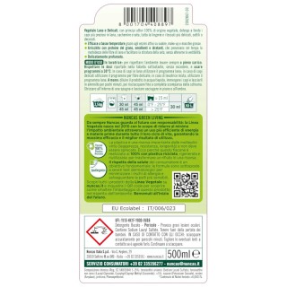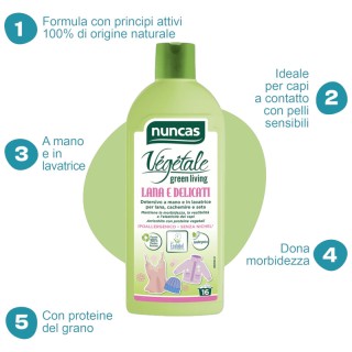 Un mondo di delicatezza sulla pelle, rispetto per l'ambiente ed efficacia. Noi di Nuncas e tutti i nostri consumatori possiamo influenzare positivamente o negativamente l'ambiente in cui viviamo, per questo abbiamo deciso di essere parte attiva di un cambiamento che man mano coinvolge sempre più persone; possiamo fare la differenza raggiungendo un equilibrio sostenibile tra attività umane, sviluppo socioeconomico, utilizzo delle risorse e capacità rigenerativa della natura. Per questo è nata Nuncas Vegetale: una gamma che da oggi si arricchisce di nuovi prodotti per soddisfare tutti i bisogni di pulizia della casa (detergenza dei tessuti, delle superfici, detersivi per lavastoviglie e molto altro).Tutti hanno rigorosamente il 100% di principi attivi di origine vegetale, totalmente e rapidamente biodegradabili, soluzioni rispettose della salute dei nostri consumatori e sono confezionati in flaconi realizzati con il 100% di plastica riciclata e riciclabili nuovamente al 100%. Nuncas Vegetale è il nostro manifesto per il cambiamento del paradigma della detergenza, un settore in cui oggi un'azienda può ridurre drasticamente l'impatto dei propri prodotti sull'ambiente circostante con una visione circolare della sostenibilità e dell'economia. Vegetale Lana e Delicati è il detersivo appositamente formulato per il lavaggio in lavatrice e a mano dei capi più preziosi in lana, cachemire e seta, della lingerie e dei tessuti più delicati, sottili o decorati. La formulazione, arricchita con enzimi speciali che non intaccano i tessuti, pulisce a fondo eliminando lo sporco alle basse temperature. Ricco di proteine del grano e di emollienti naturali, lascia i capi morbidi e idratati, senza alterare la loro vestibilità ed elasticità. E' ipoallergenico, non contiene coloranti e il contenuto di nichel è inferiore a 0,0001% soglia sotto la quale anche un soggetto sensibile non manifesta alcuna reazione allergica.
