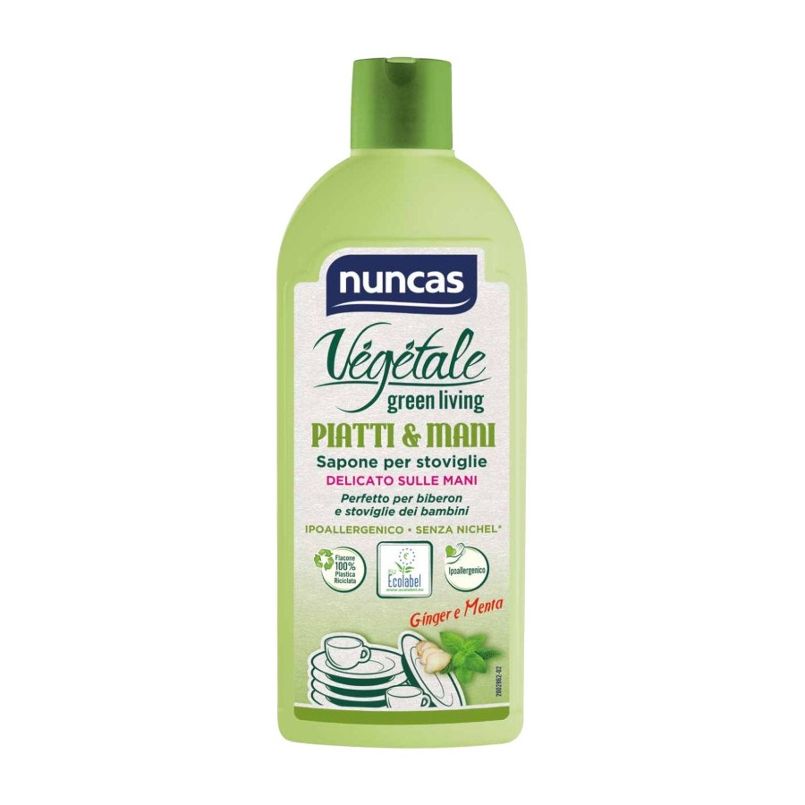 l nuovo detersivo liquido di Nuncas per il lavaggio a mano delle stoviglie. Grazie alla sua formula innovativa, ipoallergenica e dermatologicamente testata, puoi utilizzarlo in tutta sicurezza anche per lavare le mani mentre cucini. Perfetto per stoviglie dei bambini e per i biberon e per chi come noi, rispetta la salute e l'ambiente. Profumo: Ginger e Menta. Flacone 500ml