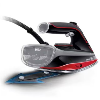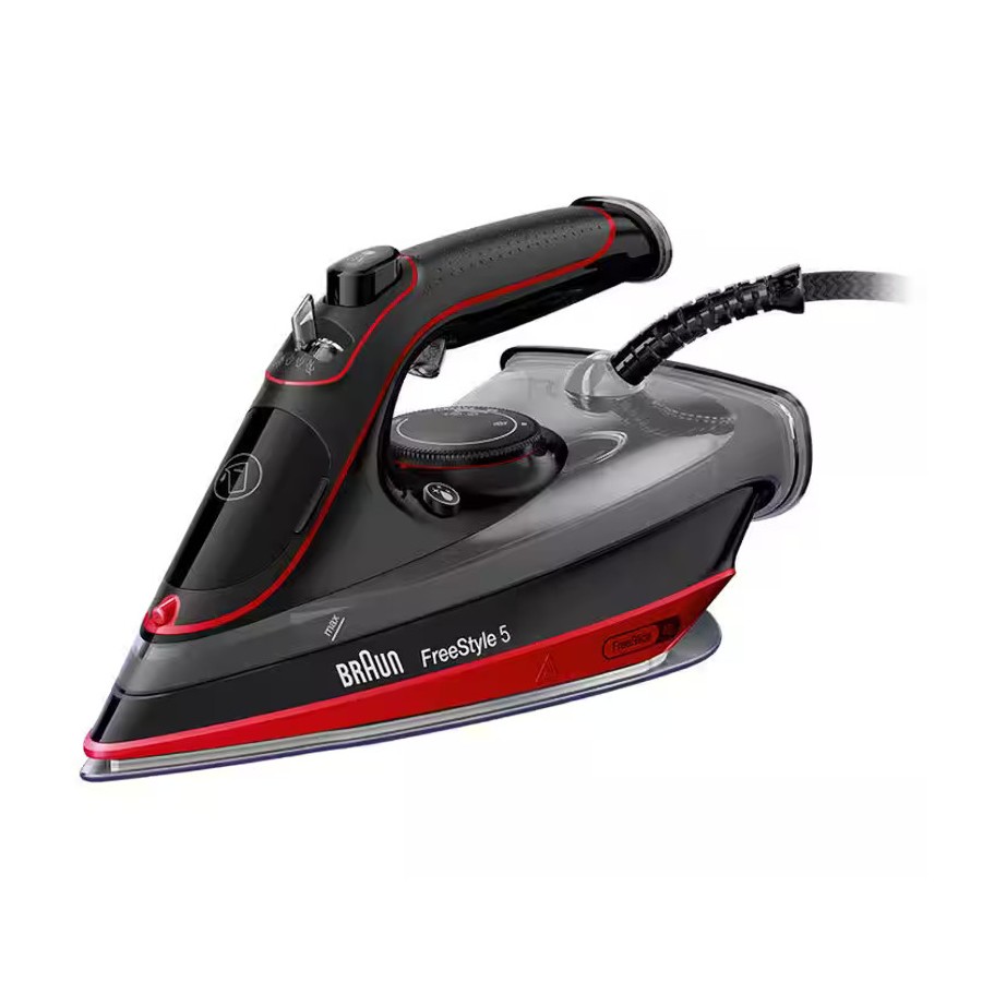 Nuovo ferro da stiro a vapore FreeStyle5 a manico aperto da 2700W, con piastra in superceramica, manico aperto ergonomico per maggior comfort e possibilità di appoggiare il ferro in verticale durante la stiratura; tecnologia FreeGlide 3D per stirare con la massima scorrevolezza in tutte le direzioni, vapore continuo 0-50g/min e getto di vapore da 220g/min, modalita? eco per risparmiare energia, punta di precisione, capacità serbatoio 300ml, auto spegnimento, sistema anti goccia e sistema anticalcare, colore rosso-nero.