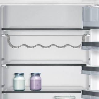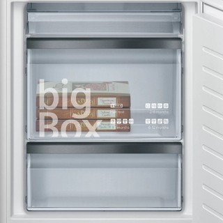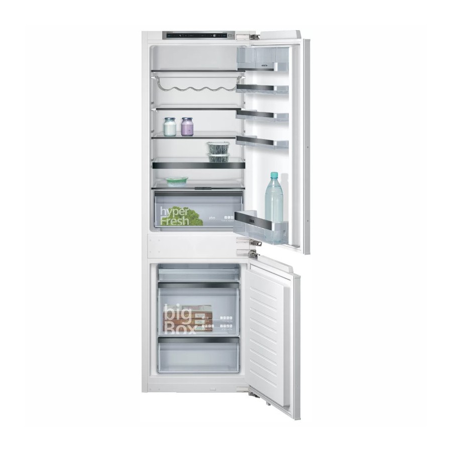 Frigorifero Incasso Combinato lowFrost. 1 cassetto hyperFresh plus con regolazione umidità, mantiene frutta e verdura fresche più a lungo. Volume vano congelatore: 74 l. Volume vano frigorifero 192 l. Rumorosità: 36 dB. Porta con Cerniera Piatta SoftClosing. Classe Energetica E. iQ500 StudioLine. Dimensioni (AxLxP) 177.2 x 55.8 x 54.5 cm
