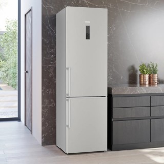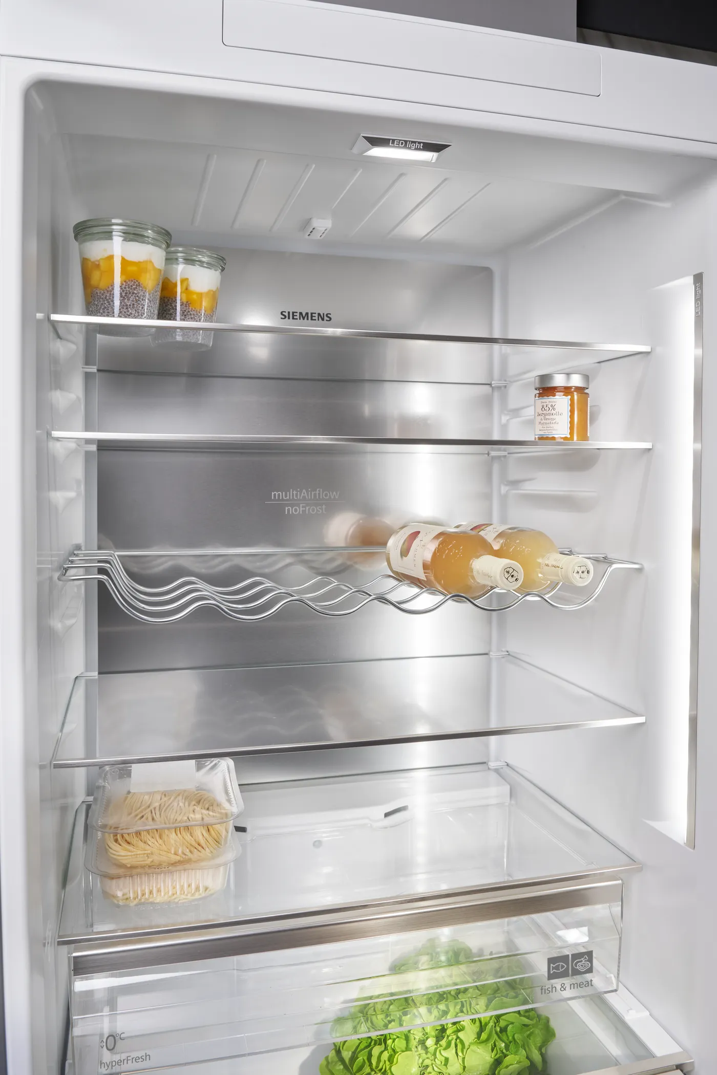 Frigorifero Combinato Total No Frost. Capacità netta totale 363 litri (260+103). 2 circuiti di raffreddamento separati. Metal backwall con sistema multiAirflow: alimenti e bevande uniformemente refrigerati su tutti i livelli.1 cassetto hyperFresh con controllo umidità per mantienere frutta e verdura freschi più a lungo. 1 cassetto hyperFresh 0°C per mantienere carne e pesce freschi più a lungo. bottleCooler: Raffredda rapidamente le tue bottiglie e le mantiene extra-fredde. Display touchControl sulla porta. Illuminazione LED nel frigorifero e nel congelatore. Rumorosità 33 dB. Serie iQ500. Classe Energetica B. Dimensioni (AxLxP) 203 x 60 x 66.5 cm.