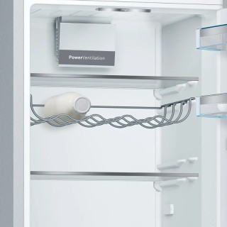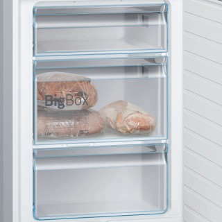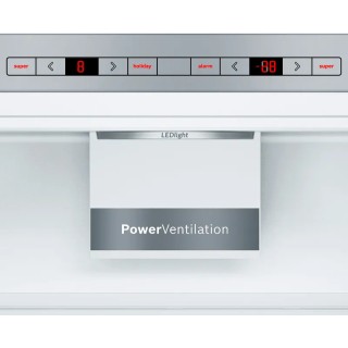 Frigorifero Combinato LowFrost. Capacità netta totale 308 litri (214+94). 1 cassetto VitaFresh con controllo umidità per mantienere frutta e verdura freschi più a lungo. 1 cassetto VitaFresh 0°C per mantienere carne e pesce freschi più a lungo. Controllo elettronico per la regolazione della temperatura attraverso display digitale. Illuminazione interna a LED. Allarme acustico porta aperta. Compressore Inverter. Rumorosità 38 dB - Serie 6 - Classe Energetica C. Dimensioni (AxLxP) 186 x 60 x 65 cm