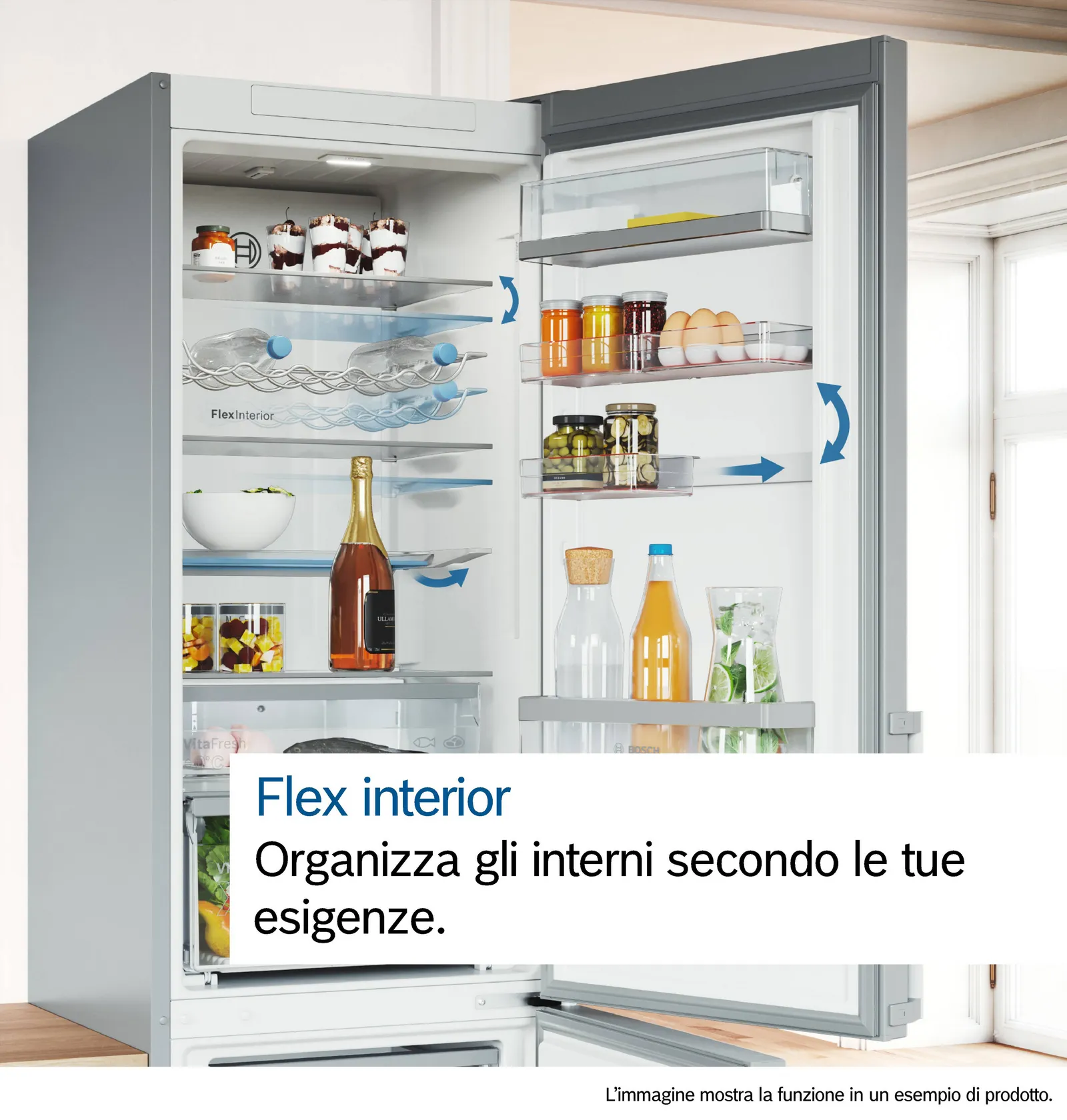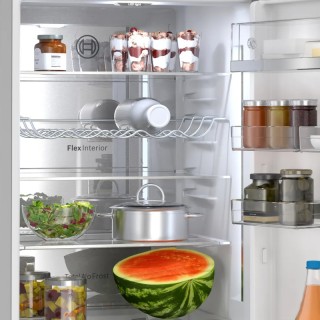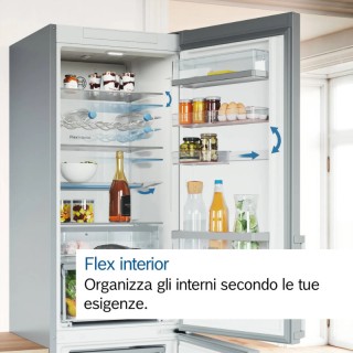 Organizza il frigorifero come desideri. Flex Interior ti offre grande flessibilità grazie ai balconcini Flex Trays e al ripiano Flex Shelf. Sistema i balconcini nel modo che preferisci grazie ai tre balconicini che possono essere posizionati in diversi modi. Grazie al ripiano Flex Shelf non c'è nessun problema per riporre oggetti alti, bottiglie o oggetti ingombranti come grandi pentole. Basta far scorrere e piegare il ripiano a metà. Conservare la tua spesa non è mai stato così facile.