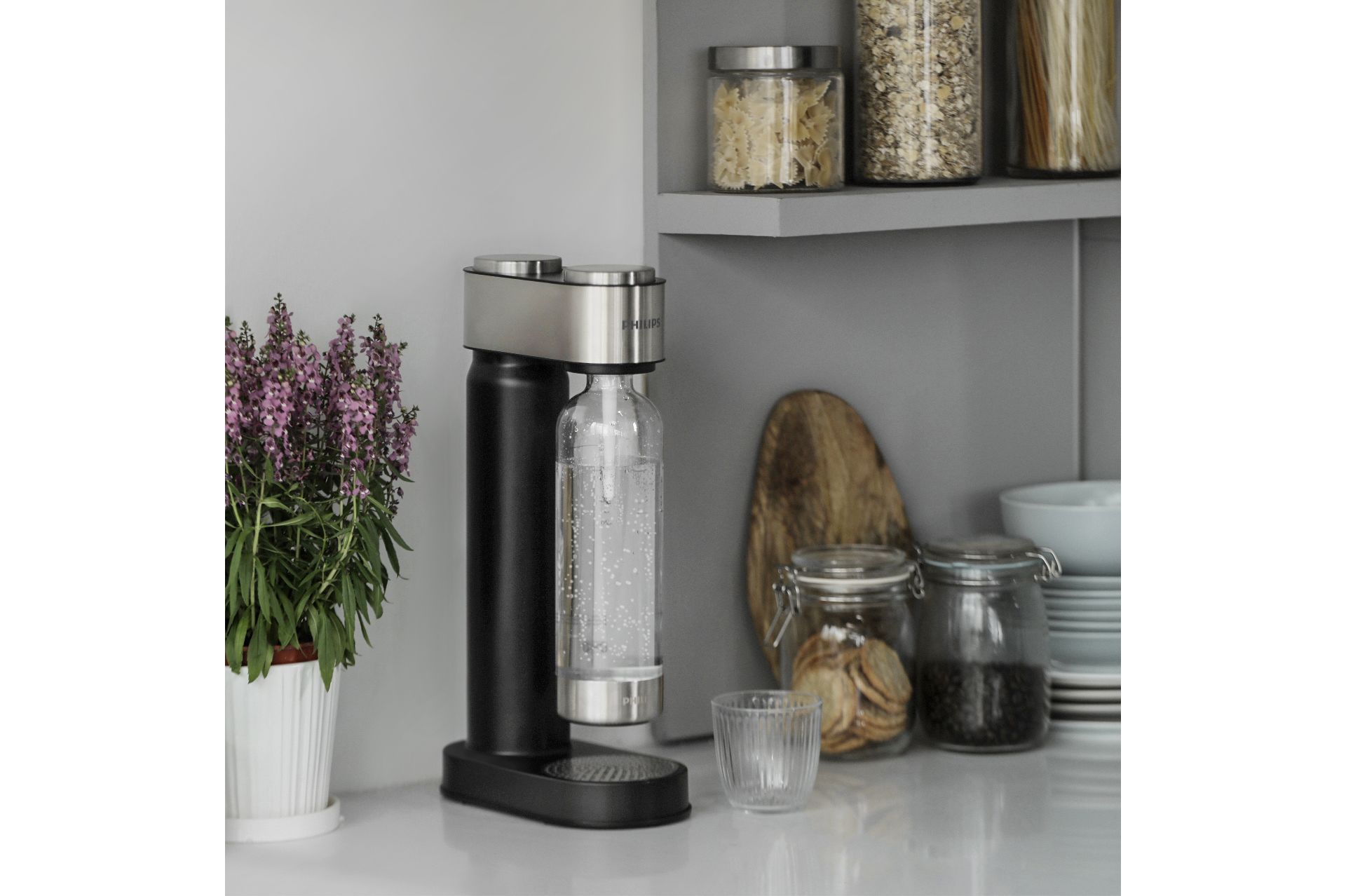 Scopri la gioia di una rinfrescante acqua frizzante ogni volta che vorrai con il gasatore Philips GoZero. Bastano 3 semplici passaggi: riempi, ruota e premi! Il design elegante con finitura in acciaio inox spazzolato si abbina facilmente allo stile della cucina o della casa.