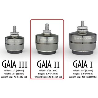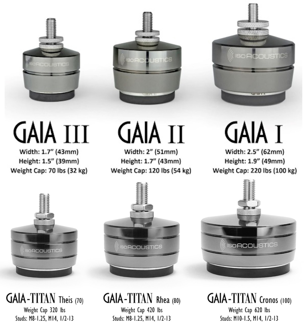 La famiglia IsoAcoustics Gaia si compone di due linee, Gaia e Gaia Titan, sintonizzati e ottimizzati per diverse fasce di peso dei diffusori. La gamma Gaia è pensata per diffusori fino a 100Kg mentre la linea Gaia Titan, introdotta nel 2019, è state creata per incrementare le performances dei diffusori High end oltre tale soglia di peso.