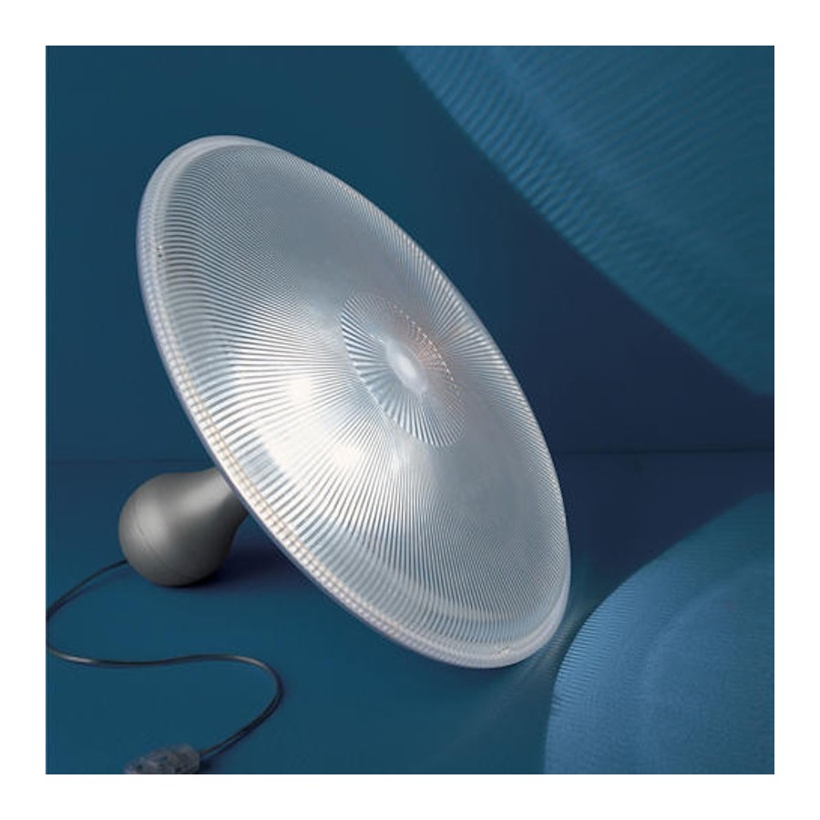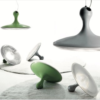 Lampada da Terra / Tavolo dal design molto audace e moderno. La struttura in metallo di forma centrale è fortemente caratterizzata dalle laccature grigio argento mentre il diffusore in materiale acrilico pressato consente un'ottima rifrazione della luce.