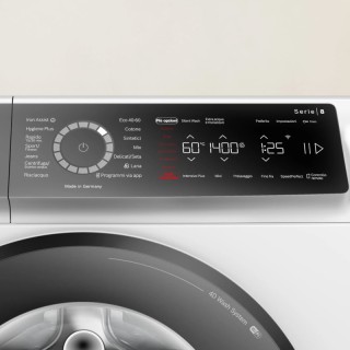 Lavatrice Standard 9 kg; 1400 giri; 4D Wash System. Motore inverter EcoSilence Drive con 10 anni di assistenza; Iron Assist: Programma con vapore che riduce le pieghe dei capi asciutti. SpeedPerfect; Anti Macchia Plus: efficace eliminazione di 16 tipi di macchie tra le più ostinate; Opzione Mini: Lava singoli capi o piccoli carichi. ActiveWater Plus; Pannello di Controllo inclinato, Tasti TouchControl; Funzione Aggiungi bucato; Cestello Wave; Pareti antivibrazioni; Serie 8; Home Connect; Classe A-20%, Dimensioni cm (AxLxP) 85 x 60 x 59 (64,8 con oblò incluso)