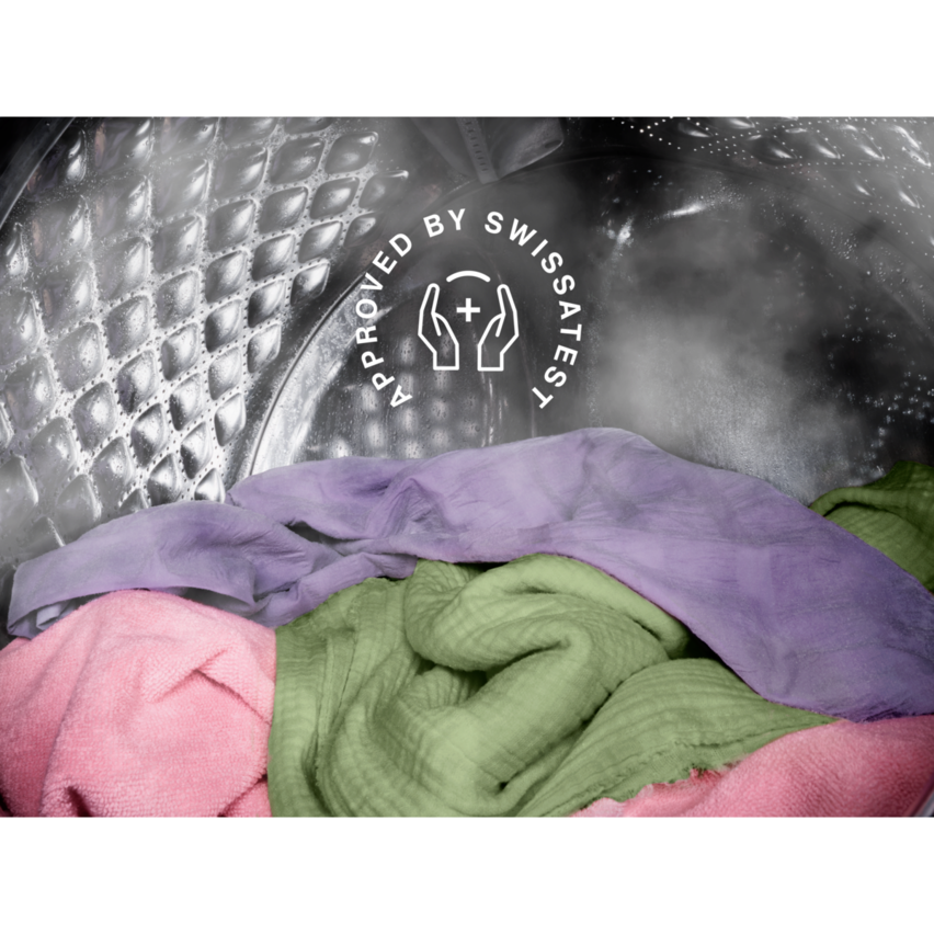 Certificato Swissatest, rimuove più del 99,99% di virus e batteri* dai vestiti, mantenendo la temperatura di lavaggio sopra ai 60°C, è anche possibile ridurre gli allergeni.