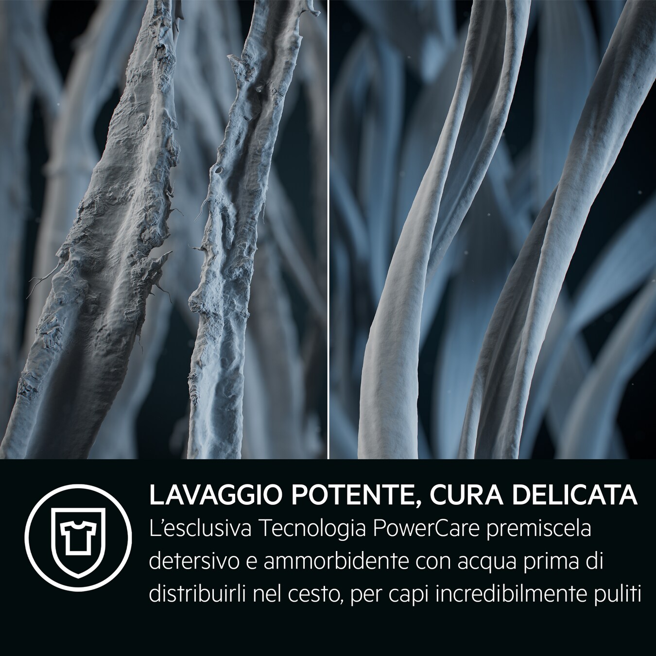 La Tecnologia PowerCare premiscela detersivo e ammorbidente con acqua prima di distribuirli nel cesto, in modo che si disciolgano completamente raggiungendo ogni singola fibra del bucato. Sprigiona la potenza pulente del detersivo per risultati eccezionali in meno di un'ora.
