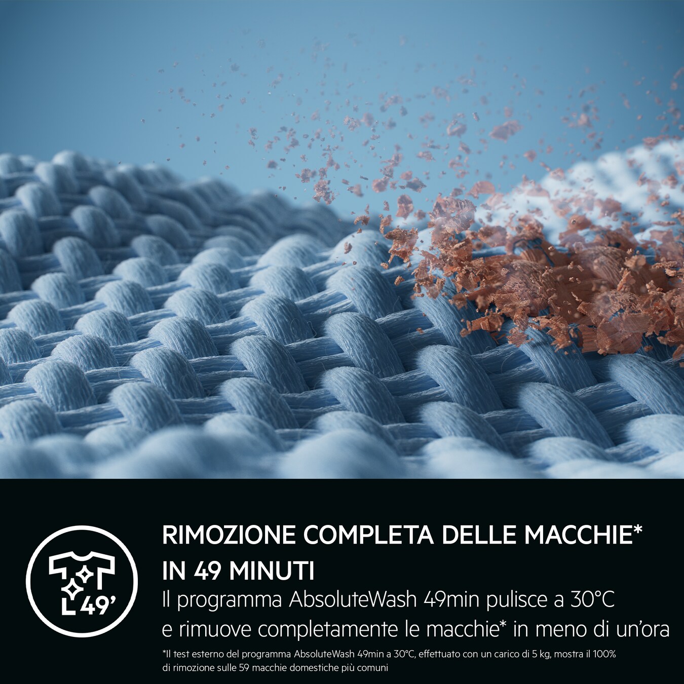 *Il test esterno del programma AbsoluteWash 49min a 30°C, effettuato con un carico di 5 kg, mostra il 100% di rimozione sulle 59 macchie domestiche più comuni.