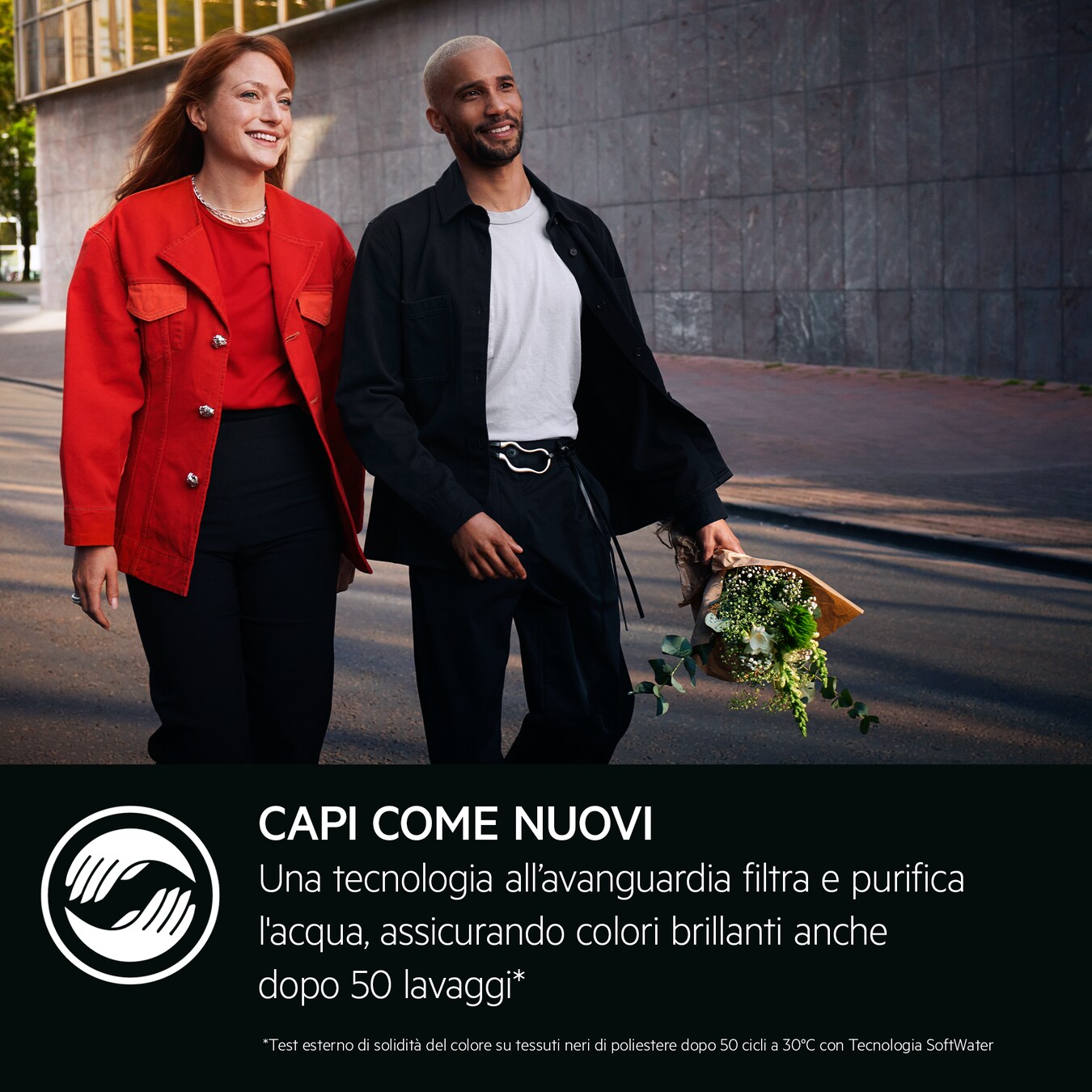 La Lavatrice Serie 9000 SoftWater utilizza l'esclusiva e innovativa tecnologia AEG per filtrare e purificare l'acqua, così i capi mantengono intatte forma e qualità* con colori vivaci nel tempo**.