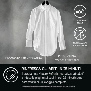 Il programma Vapore Refresh neutralizza gli odori* e riduce le pieghe sui capi, inclusi i delicati, in soli 25 minuti senza la necessità di un lavaggio completo.