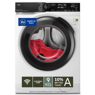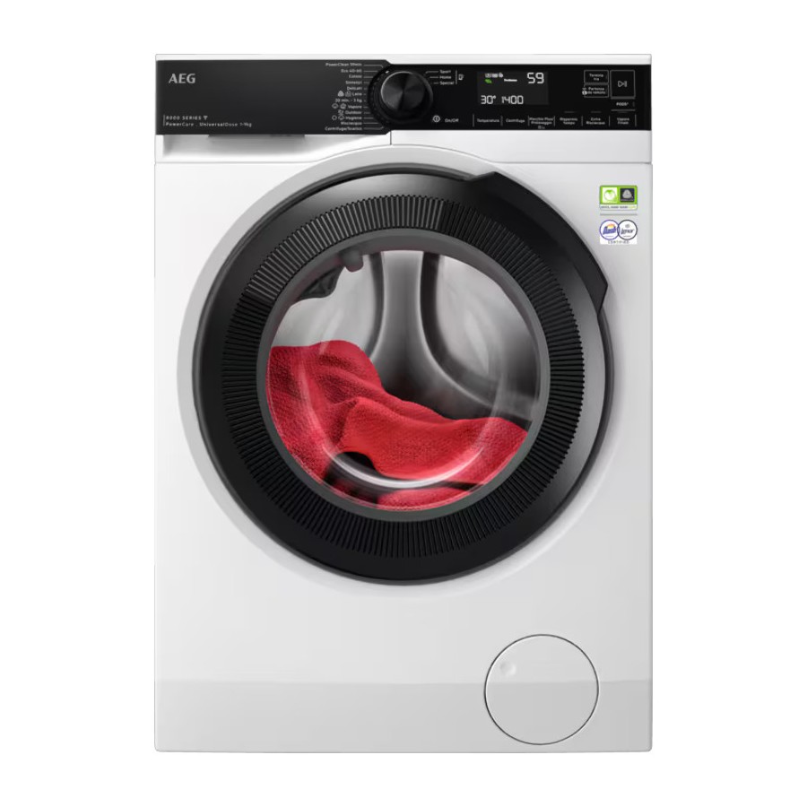 Lavatrice Standard 9 Kg, 1400 giri. Motore OKO Inverter. UniversalDose permette l'efficace dissoluzione di tutti i tipi di detersivo, comprese le PODS. PowerCare premiscela detersivo e ammorbidente con acqua prima di distribuirli nel cesto. Vapore Refresh neutralizza gli odori e riduce le pieghe sui capi in soli 25 minuti senza la necessità di un lavaggio completo. Cestello Care Drum. Silenziosità 72 dB. App My AEG Care. Serie 8000. Classe energetica: A-10%. Dimensioni (AxLxP-Pmax) 84,7 x 59,7 x 57,6-59,9 cm