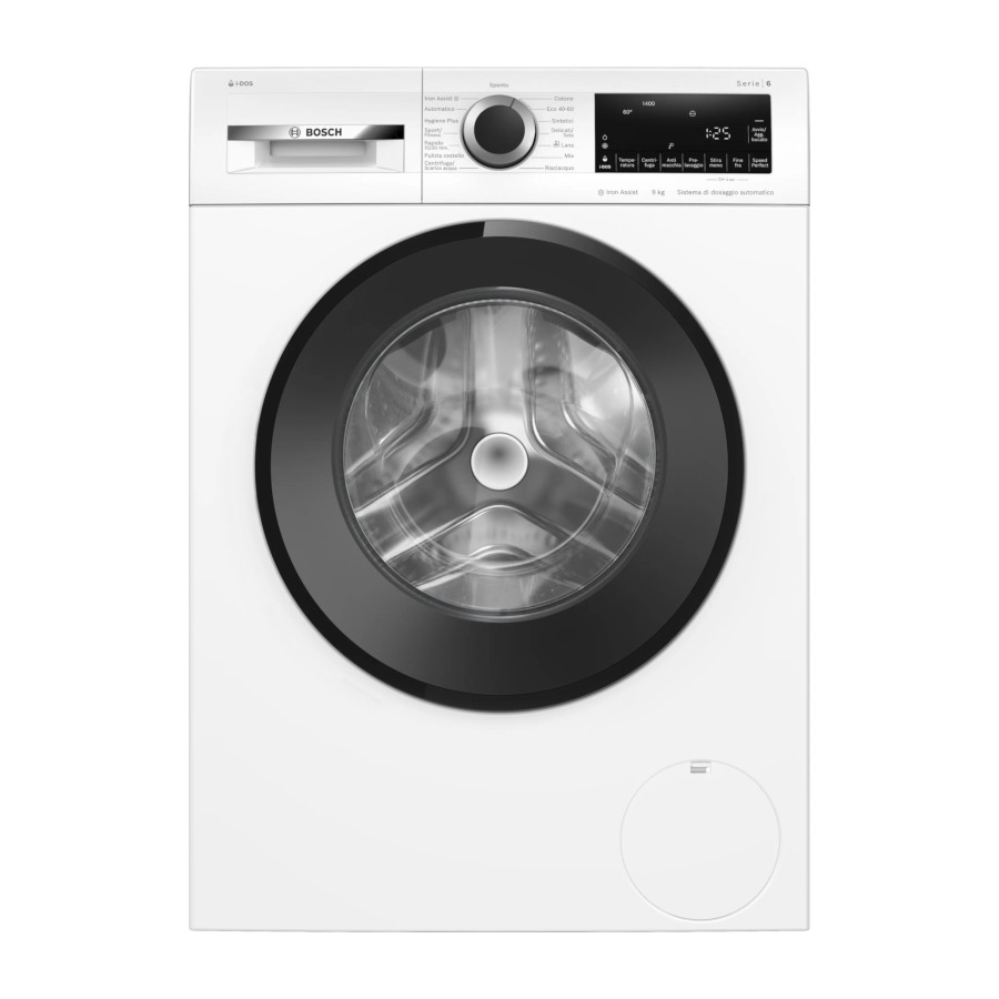 Lavatrice Standard 9 kg; 1400 giri; i-DOS: misura automaticamente la quantità esatta di detersivo e di acqua. Motore inverter EcoSilence Drive con 10 anni di assistenza; Iron Assist: Programma con vapore che riduce le pieghe dei capi asciutti. SpeedPerfect; Sistema Anti macchia per l'efficace eliminazione di 4 tipi di macchie tra le più ostinate; ActiveWater Plus; Grande display LED multifunzione; Funzione Aggiungi bucato; Cestello Wave; Pareti antivibrazioni; Sistema antiallagamento Aqua Protection Plus; Serie 6; Classe A, Dimensioni cm (AxLxP) 85 x 60 x 59 (63,2 con oblò incluso)