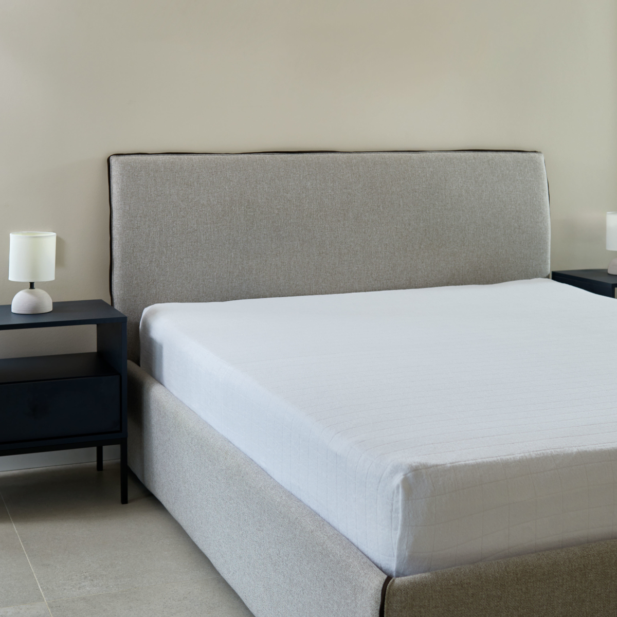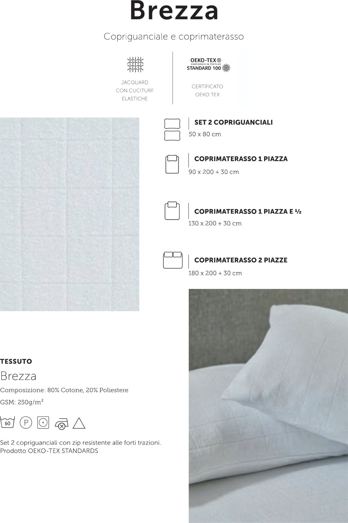 Coprimaterasso 2 piazze. 180 x 200 + 30 cm. Tessuto Brezza. Composizione: 80% Cotone, 20% Poliestere. GSM: 250g/m². Prodotto OEKO-TEX standars.