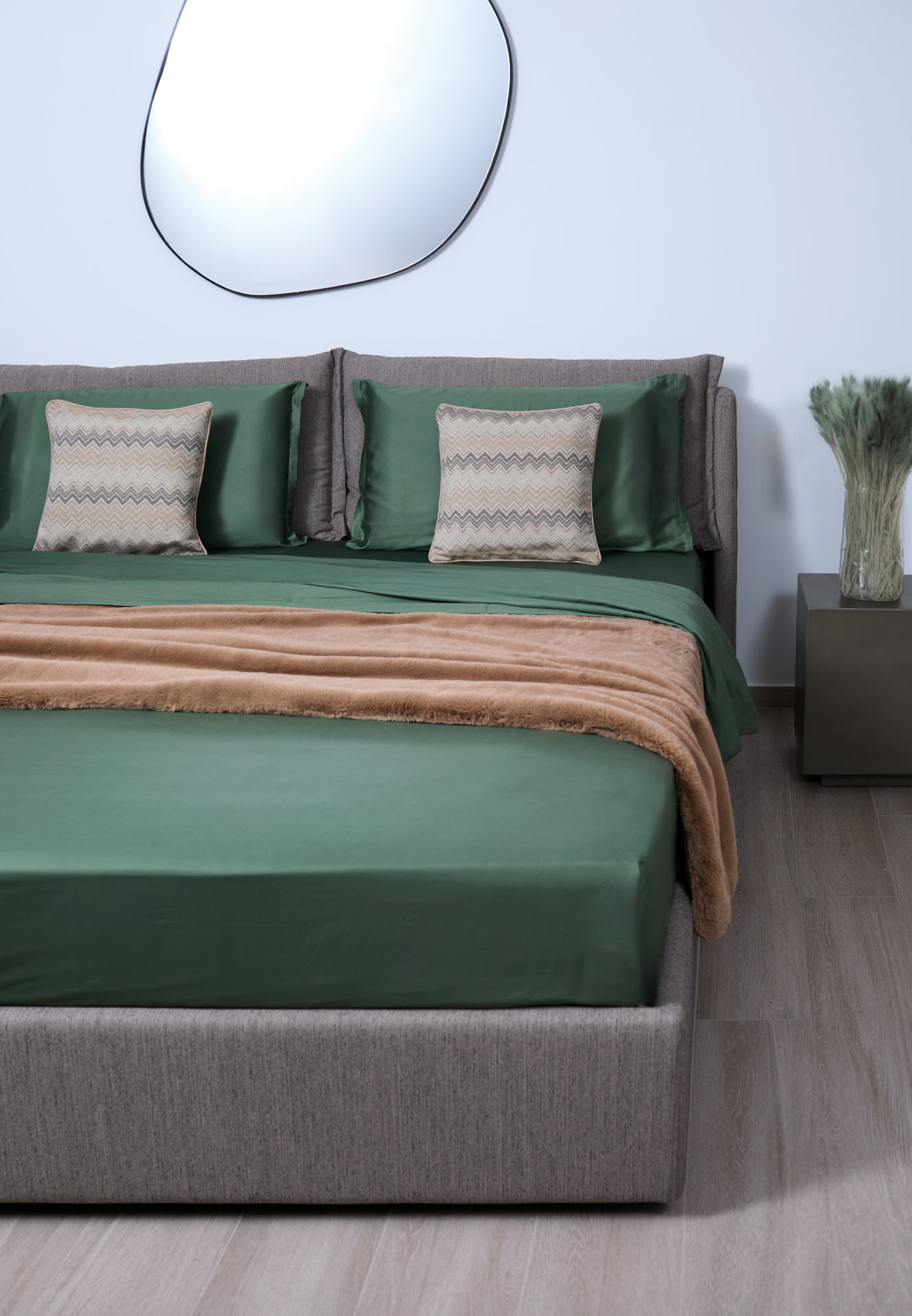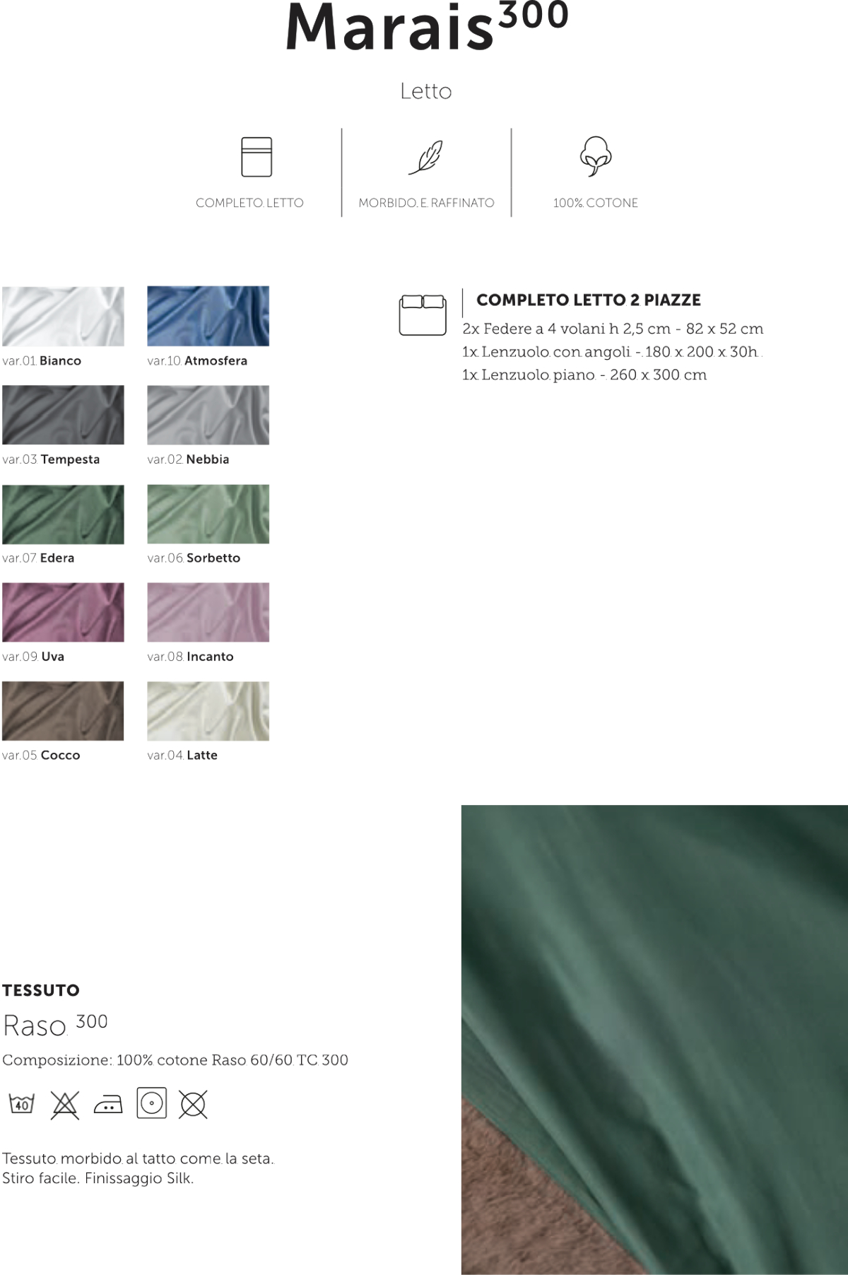 Completo letto 2 piazze composto da: 2x Federe a 4 volani h 2,5 cm - 82 x 52 cm, 1x Lenzuolo con angoli - 180 x 200 x 30h e 1x Lenzuolo piano - 260 x 300 cm. Tessuto: Raso 300. Composizione: 100% cotone Raso 60/60 TC 300. Tessuto morbido al tatto come la seta. Stiro facile. Finissaggio Silk.