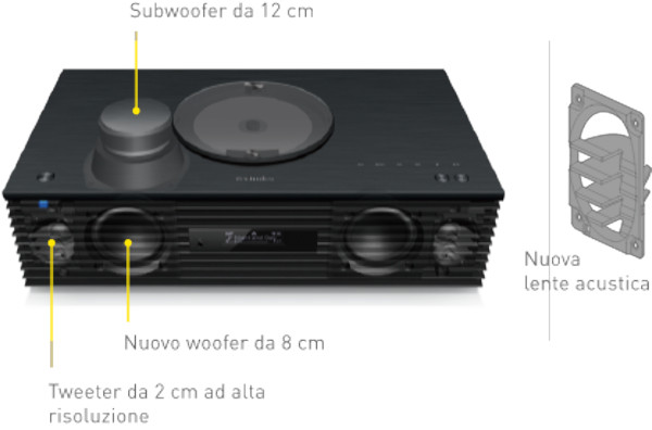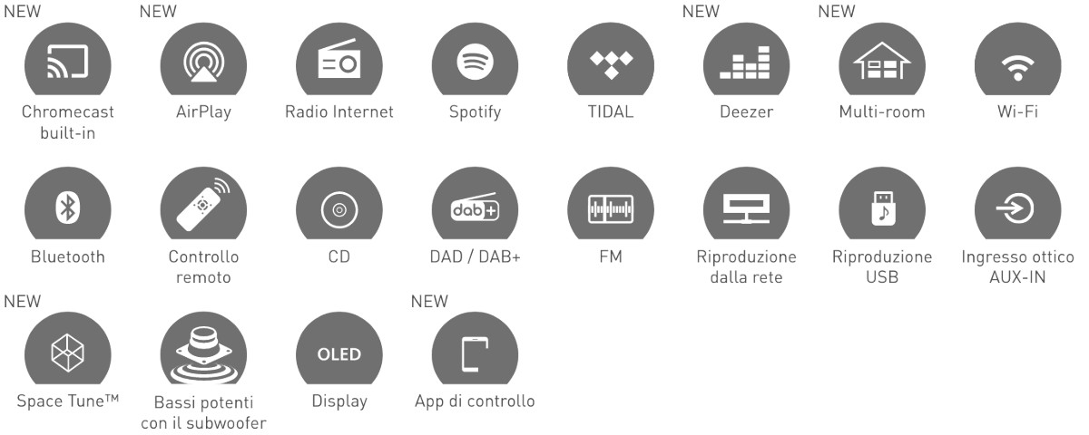 Hi-Fi All-in-One CD, USB, Line In, Optical In, FM/DAB, DLNA, Airplay 2, Bluetooth, Servizi Musicali: Spotify, vTuner, Deezer e Tidal). Multi-Room. Space Tune: ottimizza il suono per l'ambiente di ascolto. 3 Processori Jeno. Unità altoparlanti e lenti acustiche di nuova concezione. Doppia porta bass-reflex. Potenza d'uscita: 2x 30 Watt con: 2 Woofer a cono da 8 cm e 2 Tweeter a cupola da 2 cm più 40 Watt dati dal Subwoofer a cono da 12 cm. Telecomando. Dimensioni (LxAxP) 450 x 143 x 280 mm