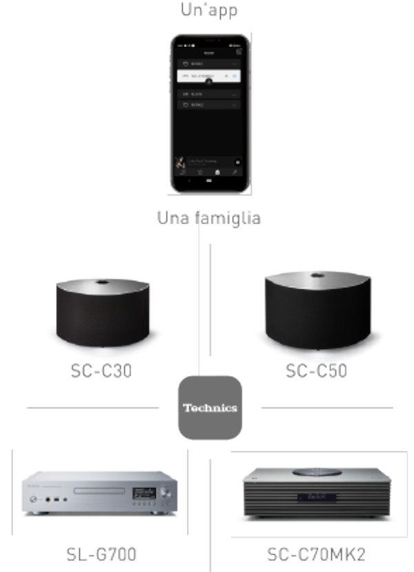 Inoltre, se utilizza l'app Technics Audio Center e si dispone di un'altra app compatibile con i dispositivi Technics, sarà possibile godere di altre sorgenti musicali in multi-room come Bluetooth, AUX, ingresso ottico, USB, radio Internet e anche di musica in streaming compatibile con OTTAVA™ f SC-C70MK2.