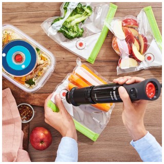 Mantieni il tuo cibo fresco più a lungo! Collega l'accessorio per sottovuoto al frullatore a immersione con un semplice clic e conserva alimenti freschi, avanzi o snack nel contenitore per sottovuoto e nei pratici sacchetti sottovuoto con cerniera a chiusura ermetica. Goditi il gusto del cibo fresco ogni giorno.