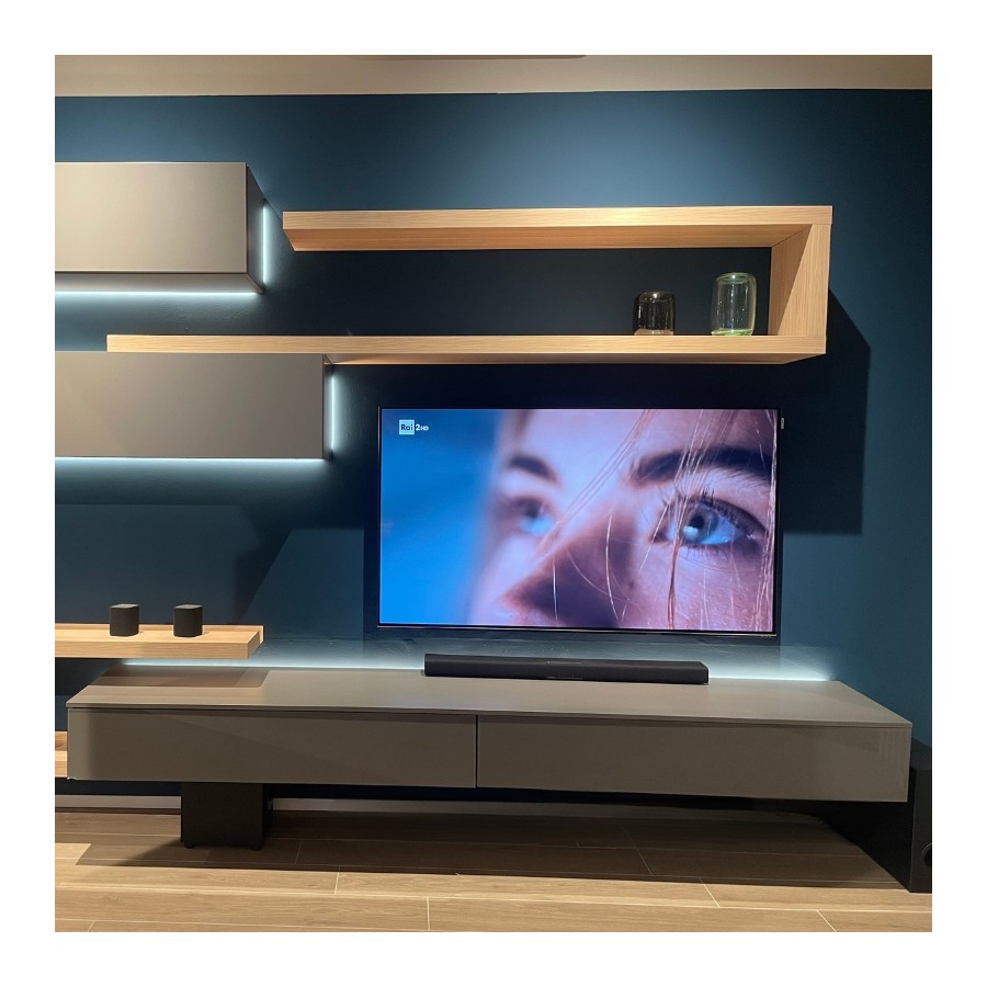 Favero Mobile Sospeso Visone Mensole Rovere Miele Contenitori Cassetto e Ribalta Illuminazione Led