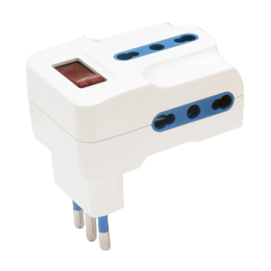 Adattatore triplo con 3 prese bivalenti e spina da 10A con interruttore di protezione termico con il sovraccarico. Prese con alveoli protetti salvabambino