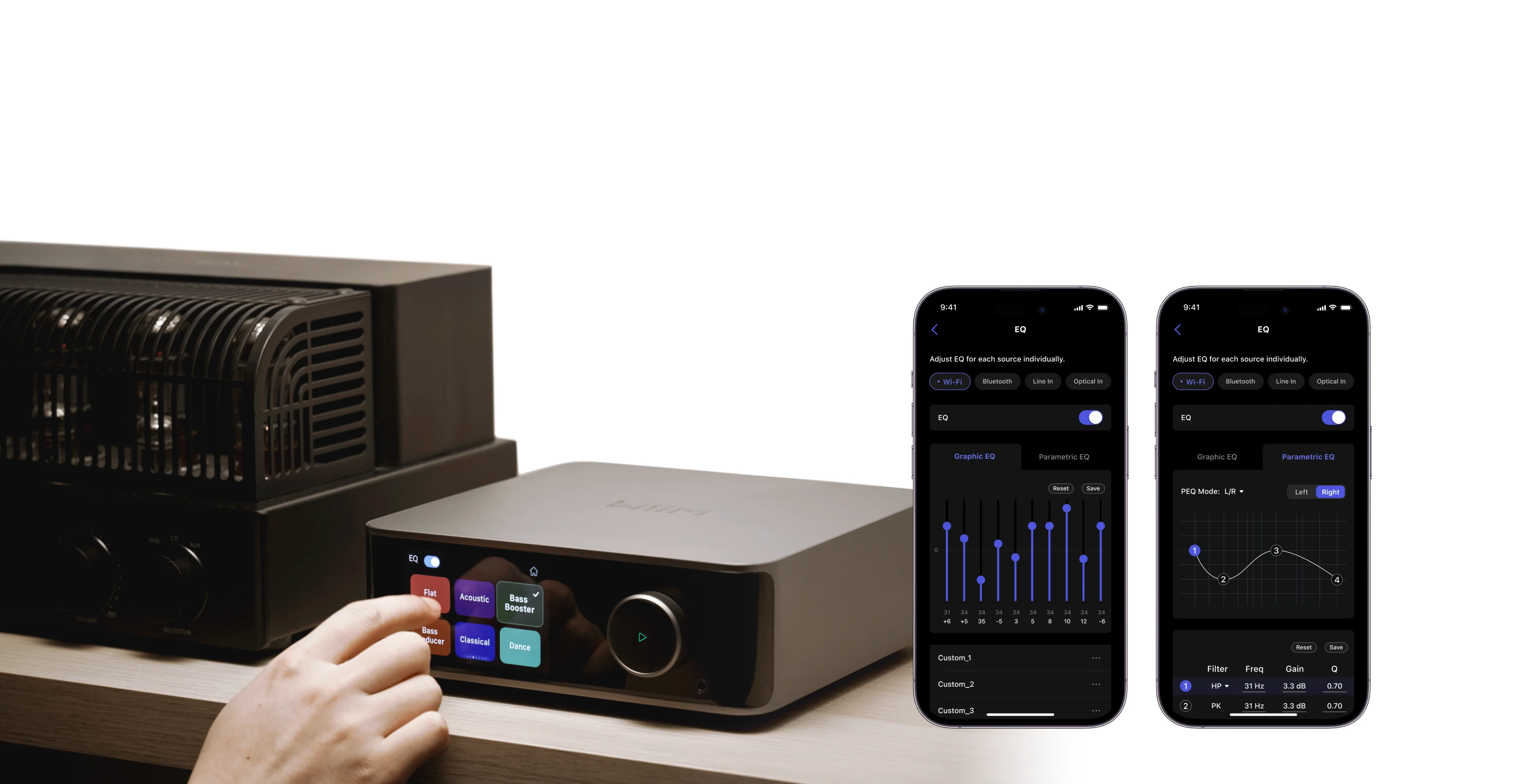 - 24 impostazioni EQ preimpostate, EQ grafico a 10 bande, EQ parametrico a 10 bande