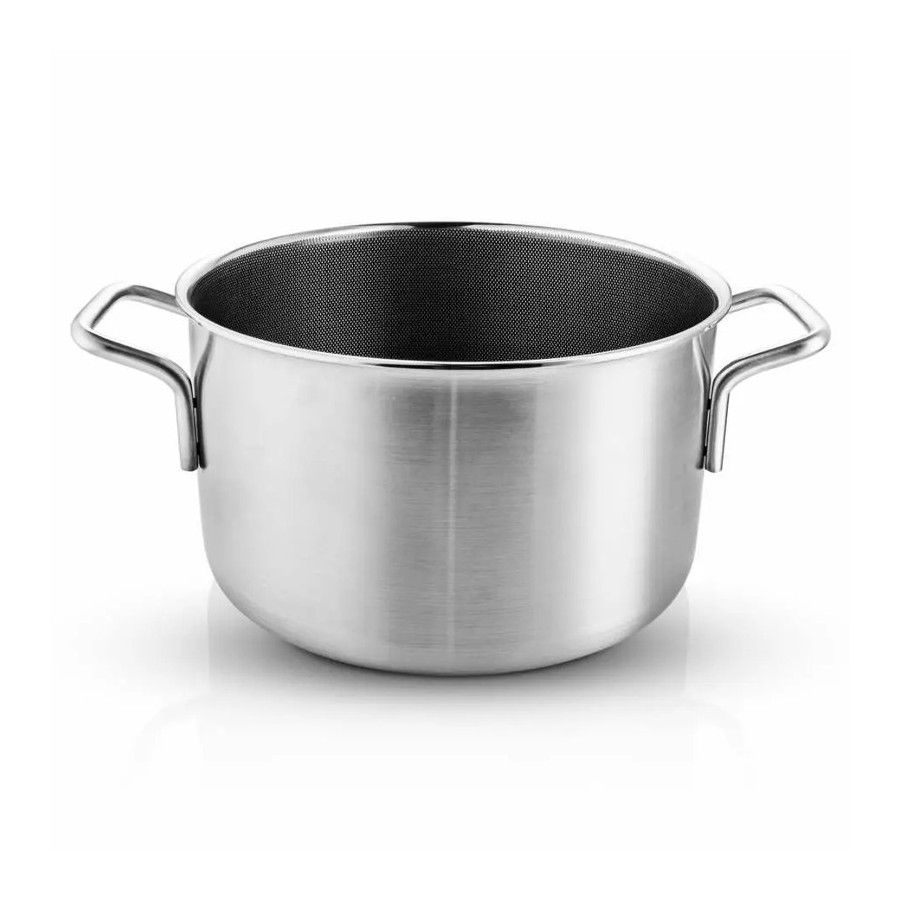Questa pentola unisce il design e la rinomata qualità di Eva Trio a miglioramenti e materiali di ultima generazione. L'interno è rivestito con un motivo accattivante in acciaio inossidabile nella parte superiore e un rivestimento antiaderente in ceramica Slip-Let® nella parte inferiore. Questa combinazione riduce il rischio che gli ingredienti si attacchino o brucino, mentre il rivestimento è così resistente che è possibile utilizzare utensili in metallo in tutta sicurezza senza il rischio di danneggiarli. Il corpo della pentola è realizzato con una combinazione di acciaio inossidabile riciclato post-consumo al 90% e alluminio riciclato post-consumo al 100%. L'esclusivo design a sandwich multistrato garantisce un riscaldamento rapido, una distribuzione uniforme del calore e un esterno robusto e resistente all'usura. La pentola è adatta al forno fino a 400 °C ed è compatibile con tutte le fonti di calore, inclusa l'induzione. È facile da pulire in lavastoviglie o con una paglietta in acciaio. Questa pentola si basa sul classico design Ole Palsby/Eva Trio del 1977, il che garantisce che offra ancora le rinomate caratteristiche Eva Trio, come i manici freddi, il beccuccio versatore, l'impilabilità e la compatibilità con i coperchi e gli altri articoli della gamma Eva Trio.
