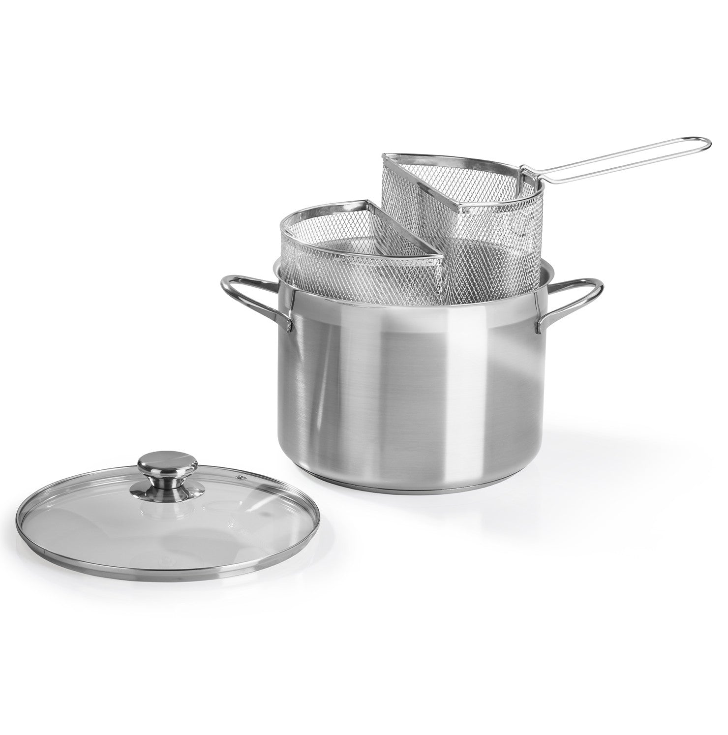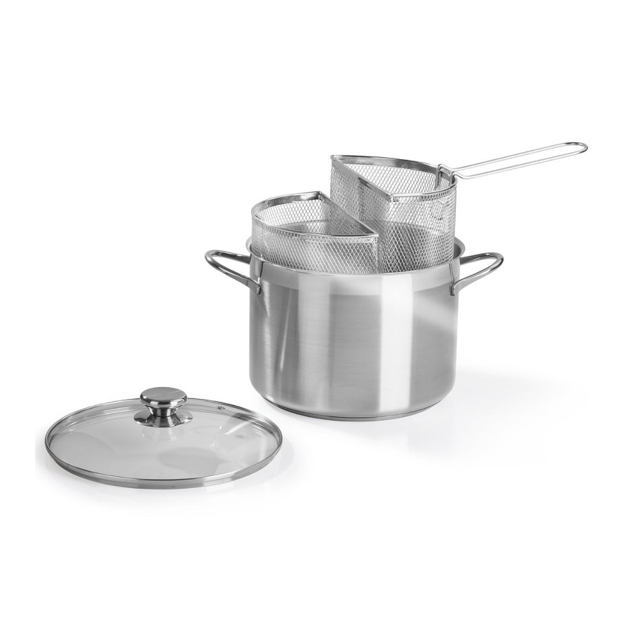 Spaghettiere con Doppio Cestello in rete acciaio inox. Diametro 24 cm Capienza 7,25 litri. Fondo Triplen a 3 strati, acciaio-alluminio-acciaio. Coperchio in vetro temperato trasparente, con sfiato per il vapore. Adatto a tutti i piani di cottura: gas, induzione, elettrico. Lavabile in lavastoviglie.