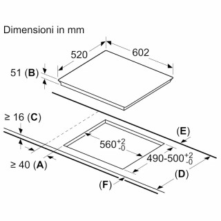 - Dimensioni del vano per l'installazione (AxLxP): 51 x 560-560 x 490-500 mm