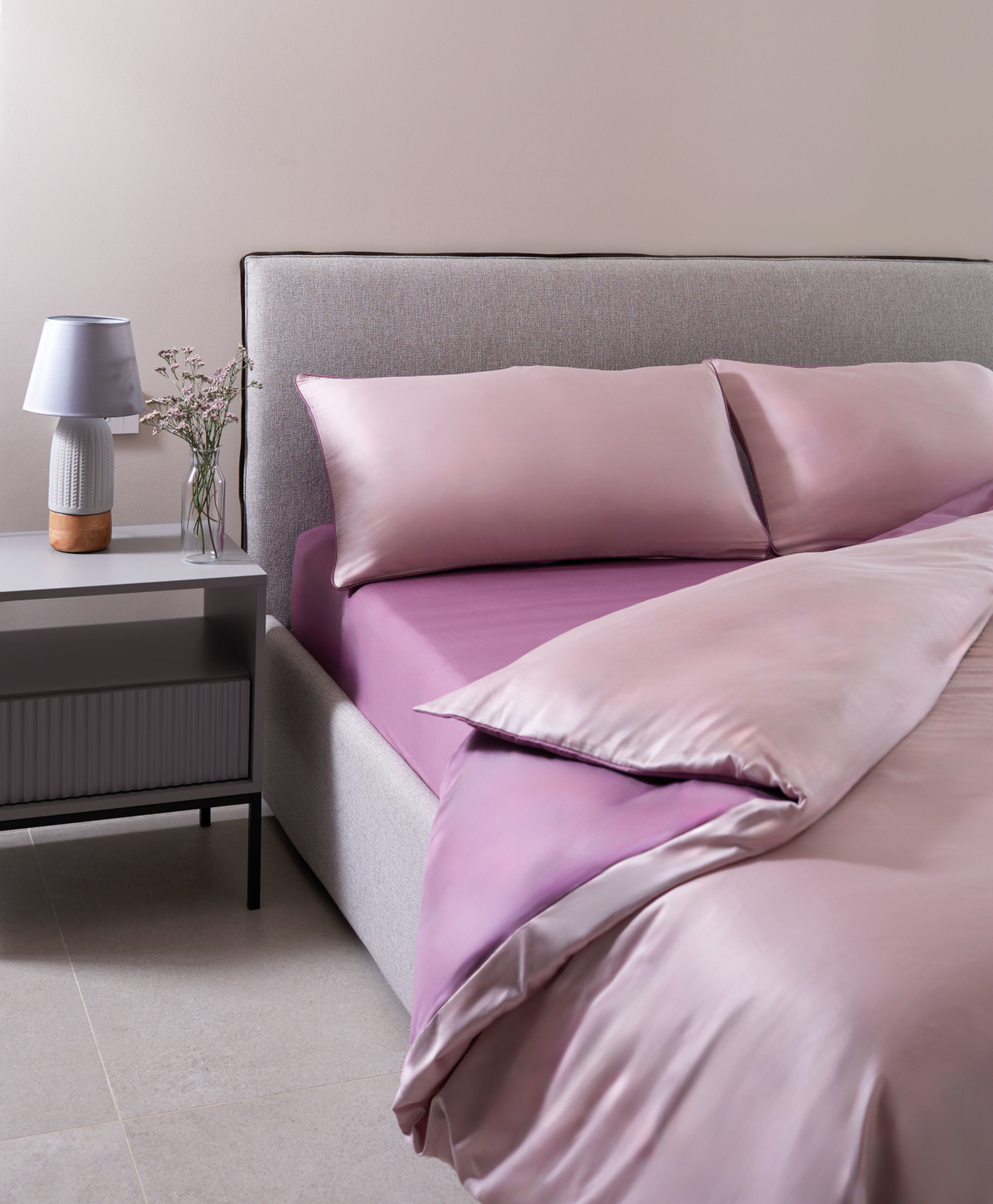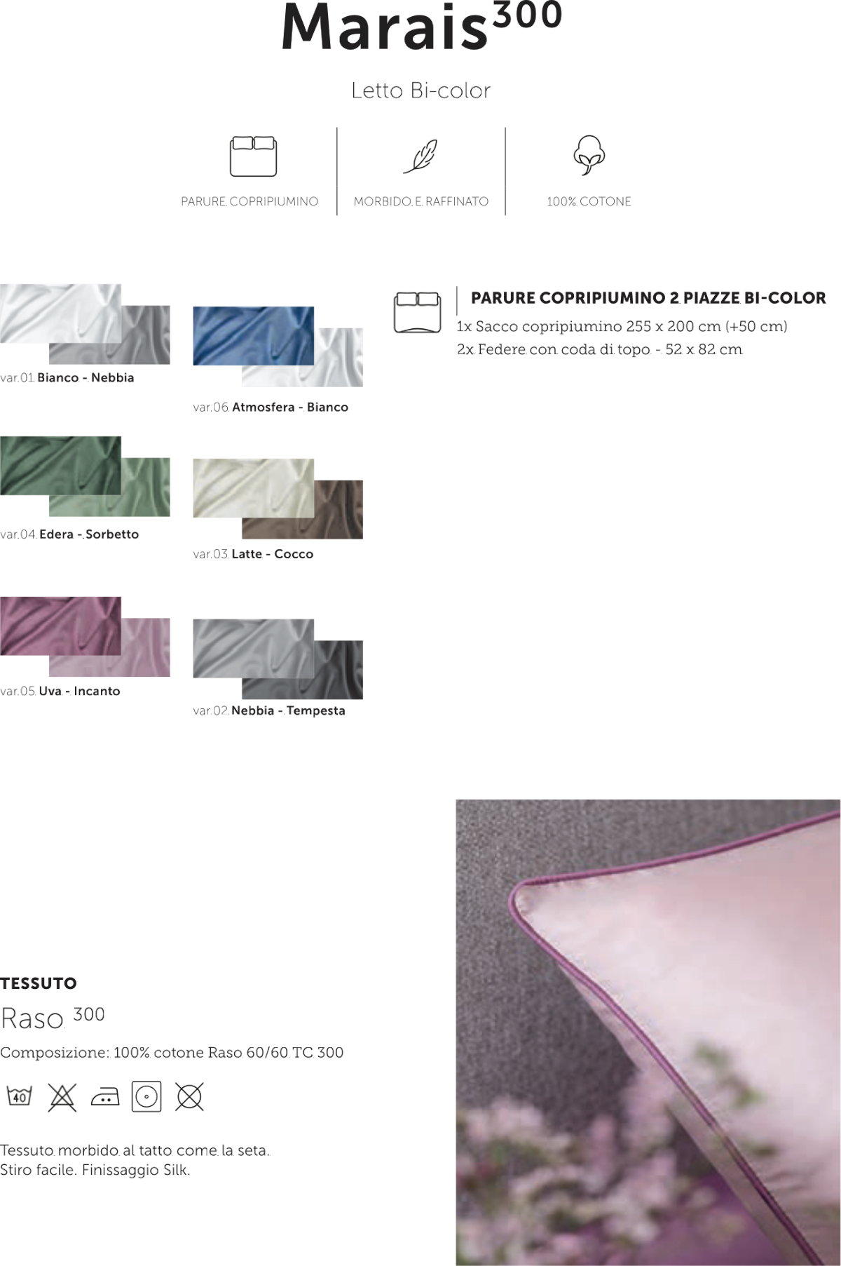 Parure Copripiumino 2 Piazze Bi-Color composta da 1x Sacco copripiumino 255 x 200 cm (+50 cm) e 2x Federe con coda di topo - 52 x 82 cm. Tessuto Raso 300. Composizione: 100% cotone Raso 60/60 TC 300. Tessuto morbido al tatto come la seta. Stiro facile. Finissaggio Silk.