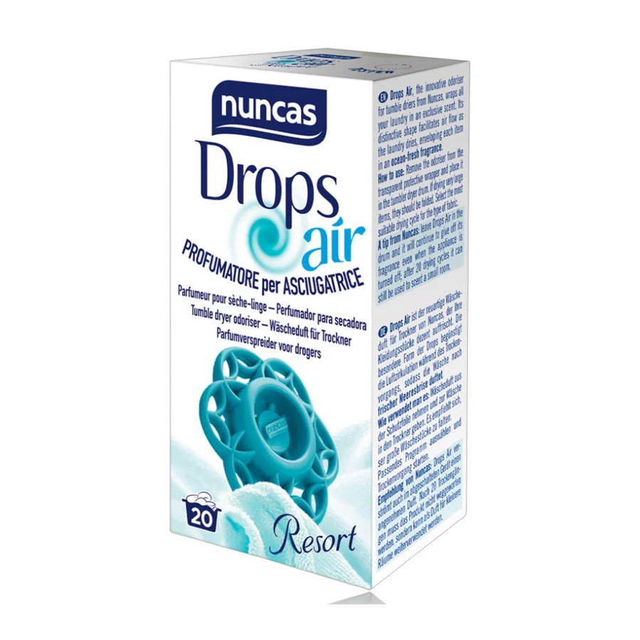 Profumatore specifico per asciugatrice, profuma il tuo bucato eliminando lo sgradevole odore di umidità. La sua forma, unica e brevettata, è stata appositamente studiata da Nuncas per rilasciare gradualmente ed uniformemente la profumazione sui capi. Drops Air è specifico per asciugatrici a pompa di calore perchè non superano i 100°C. Disponibile in 3 fragranze raffinate, questa è Resort.