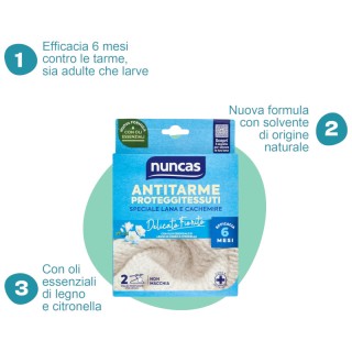 Semplice! Con i nuovi ANTITARME PROTEGGITESSUTI di Nuncas, che da sempre sono sinonimo di garanzia contro gli attacchi delle tarme e da oggi lo sono ancora di più! La nuova formula, studiata secondo i criteri della normativa europea, infatti, protegge i tessuti per ben 6 mesi, eliminando le tarme adulte ma soprattutto le larve, che sono le principali responsabili dei temuti fori. Per più di una stagione i capi saranno ben protetti e non bisognerà preoccuparsi di sostituire frequentemente foglietti o cialde, perché la loro azione dura 6 mesi.