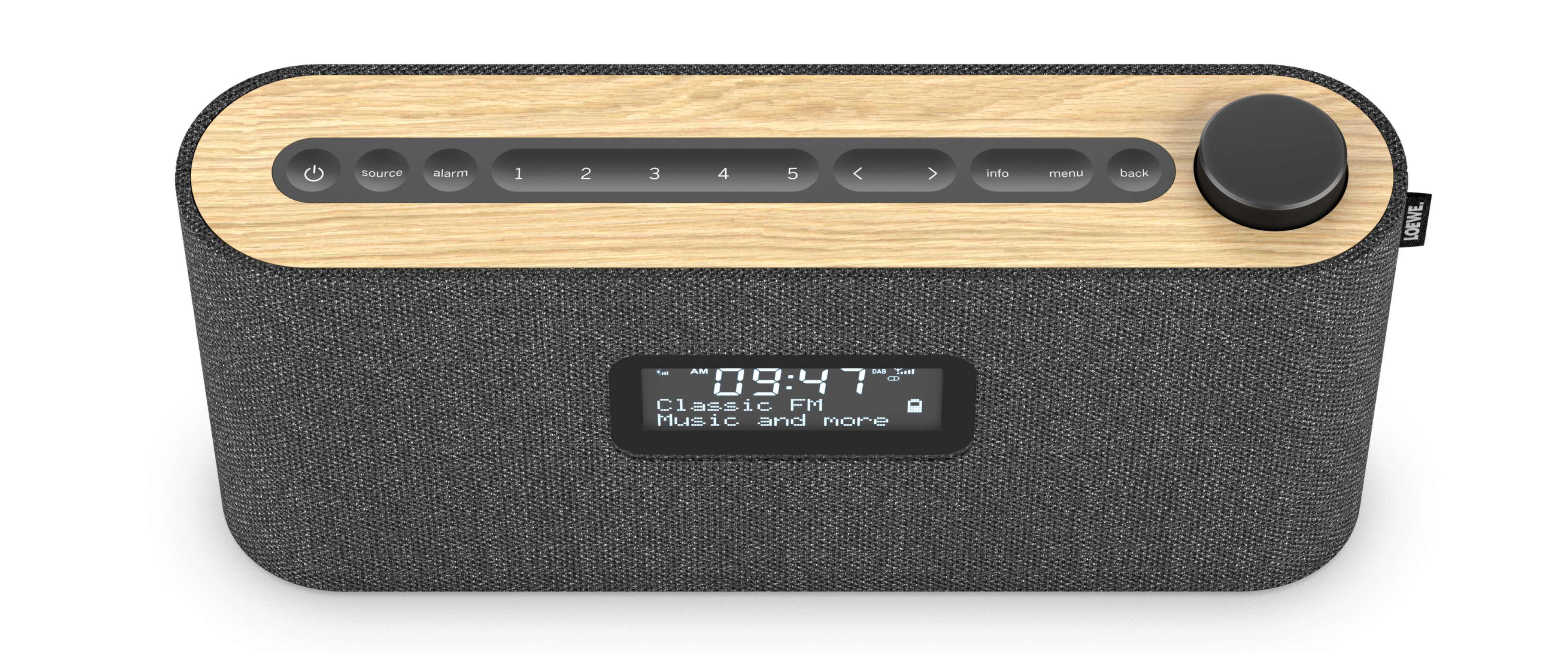 Radio stereo con FM RDS, DAB+, EWF e Bluetooth. 28 watt di potenza musicale totale. Display dimmerabile, sveglia e funzione snooze. USB-C con caricabatteria, fino a 14 ore di autonomia portatile, leggera e robusta. Intarsi in vero legno di quercia sulla parte superiore e inferiore. Dimensioni (LxAxP) 21,1 × 13,2 × 6,8 cm