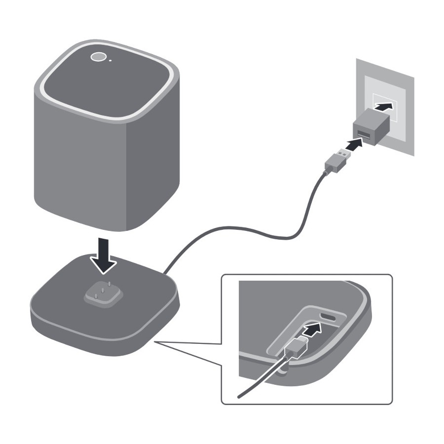 Base di ricarica per le casse posteriori WS-X1A alimentata con cavo USB di tipo C in dotazione con il diffusore. Alimentatore USB 5V 2A non compreso. Dimensioni: (LxAxP) 88 x 19 x 8 mm