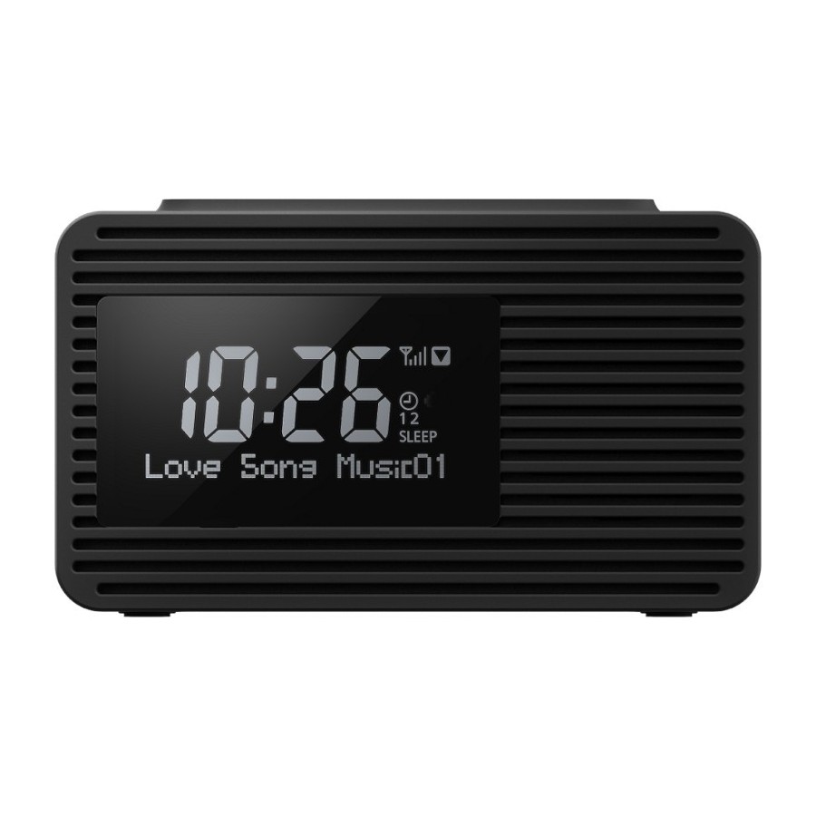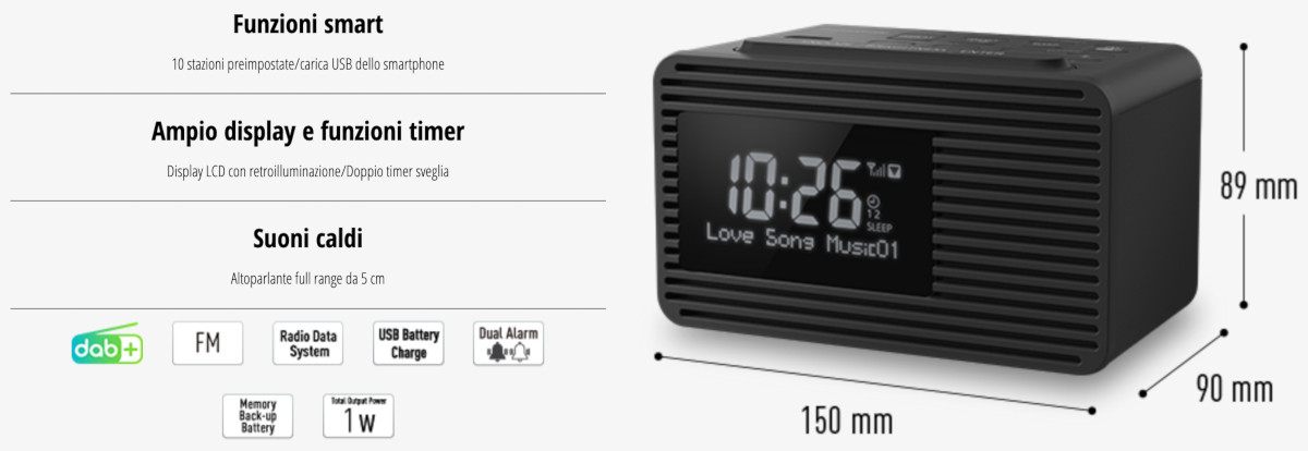 Radiosveglia DAB + FM. 10 stazioni preimpostate. Carica USB dello smartphone. Display LCD con retroilluminazione. Varie funzioni timer: orologio / doppia sveglia / sleep. Altoparlante full range da 5 cm. Dimensioni (LxAxP) 150 x 89 x 90 mm