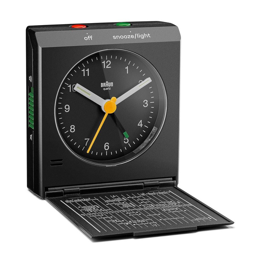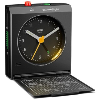 Sveglia analogica da viaggio Braun Classic con funzione snooze e luce, dimensioni compatte, coperchio pieghevole con mappa dei fusi orari mondiali, movimento al quarzo silenzioso, allarme con segnale acustico crescendo, colore nero, modello BC05B.