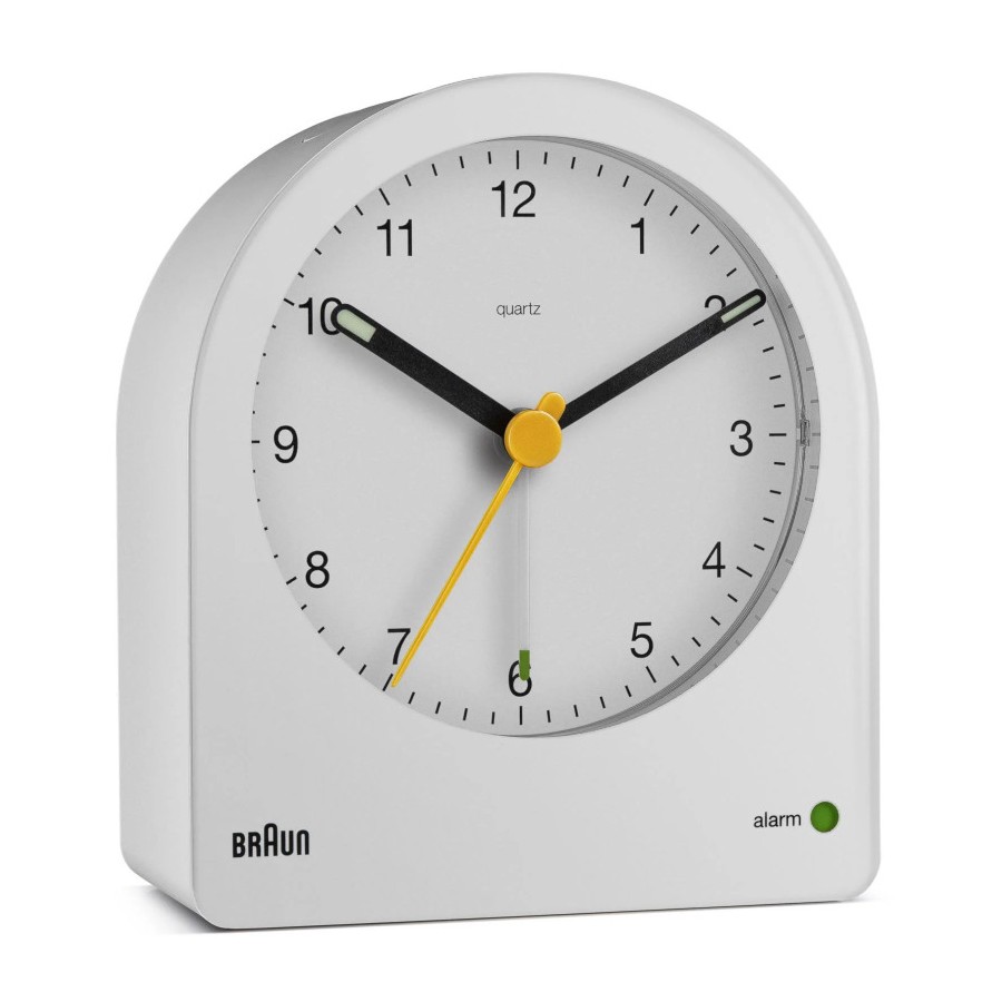 La sveglia analogica classica BC22 è unica nella forma. La sua silhouette deriva dall'orologio AB 2 progettato nel 1984 da Dieter Rams. Il quadrante pulito e semplicistico e le lancette a contrasto con punte luminose offrono un'ottima leggibilità. L'aggiunta dell'iconica lancetta dei secondi gialla è sinonimo della pluripremiata storia del design Braun e dell'estetica duratura.