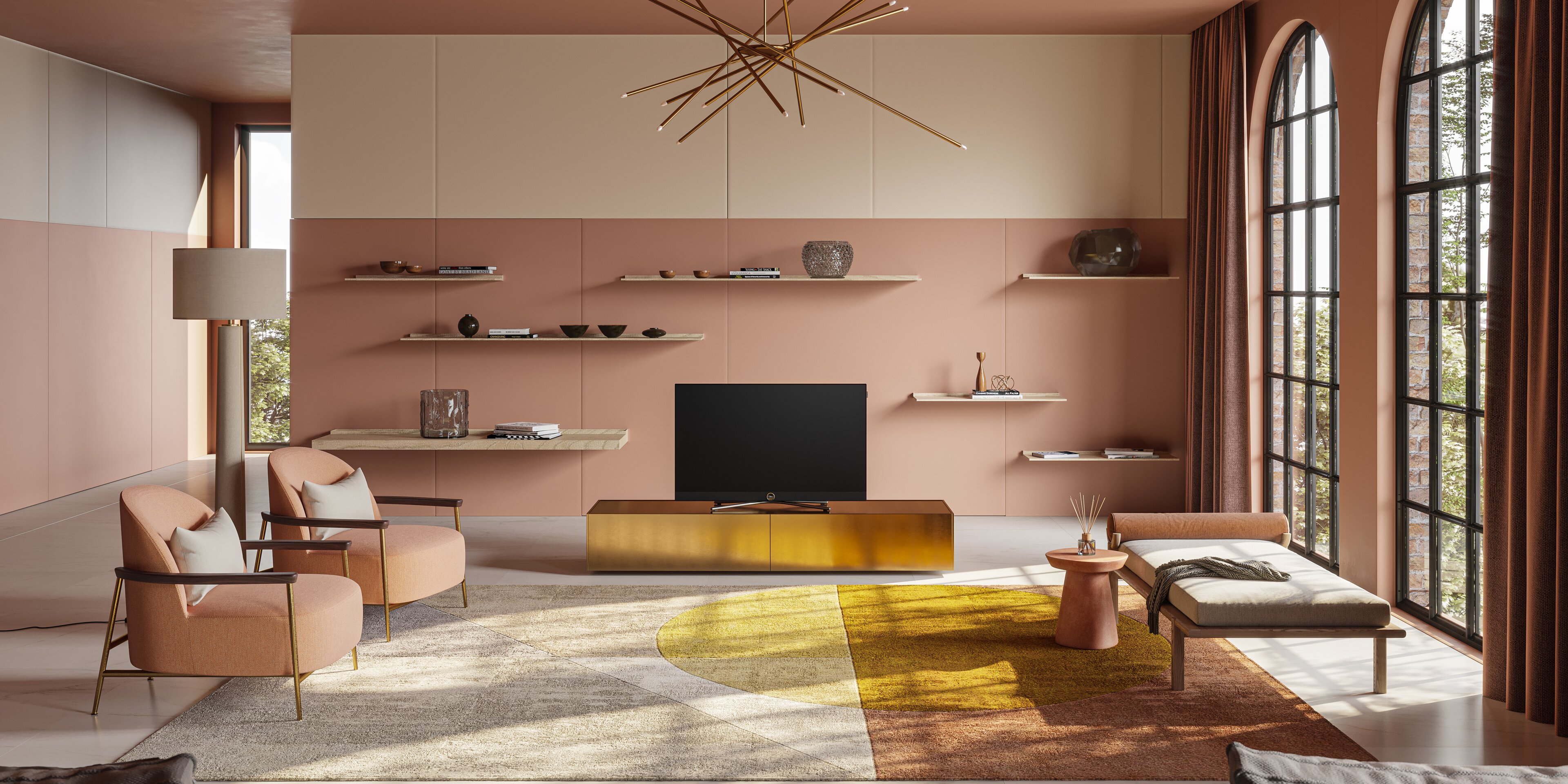 Loewe callas colpisce per il suo design elegante, caratterizzato da una soundbar rivestita in tessuto, gestione dei cavi integrata, coperture discrete, connessioni nascoste e cabinet verniciato a spruzzo per un design sofisticato a 360° senza paragoni. La costruzione meccanica è intelligente e robusta, con solidi bulloni VESA integrati nella struttura principale in metallo. struttura principale in metallo. Un supporto da tavolo girevole in metallo con finitura finitura cromata crea un aspetto raffinato.