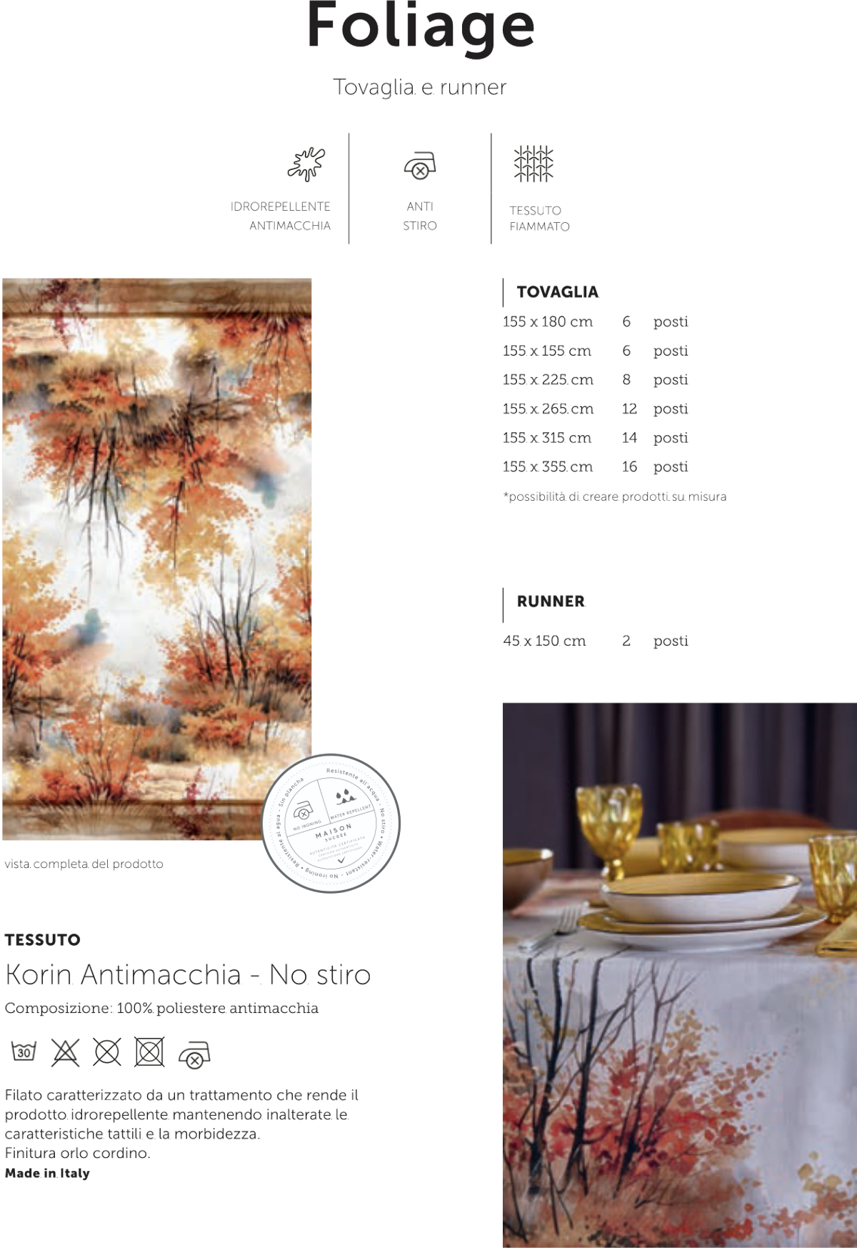 Tovaglia Antimacchia Stampata. No stiro. 100% Poliestere. Linea Korin